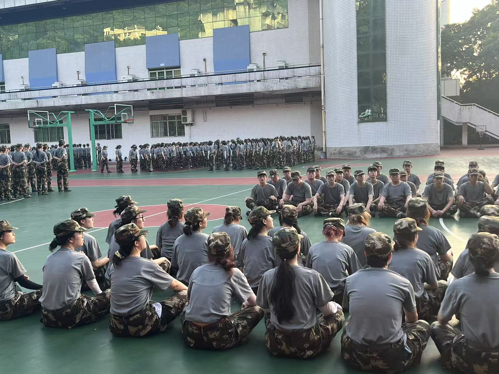 夏日的阳光毫无保留地倾泻而下,无情地洒在同学们挺拔的身躯上。汗水如断了线的珠子,顺着脸颊、脊背不停地流淌,很快便湿透了厚重的迷彩衣衫。尽管双腿如同灌了铅般沉重,腰背酸痛到难以忍受,但在这片绿茵场上,没有一个人选择退缩。他们紧咬牙关,凭借着顽强的意志,始终以昂扬的姿态坚守在自己的岗位上。