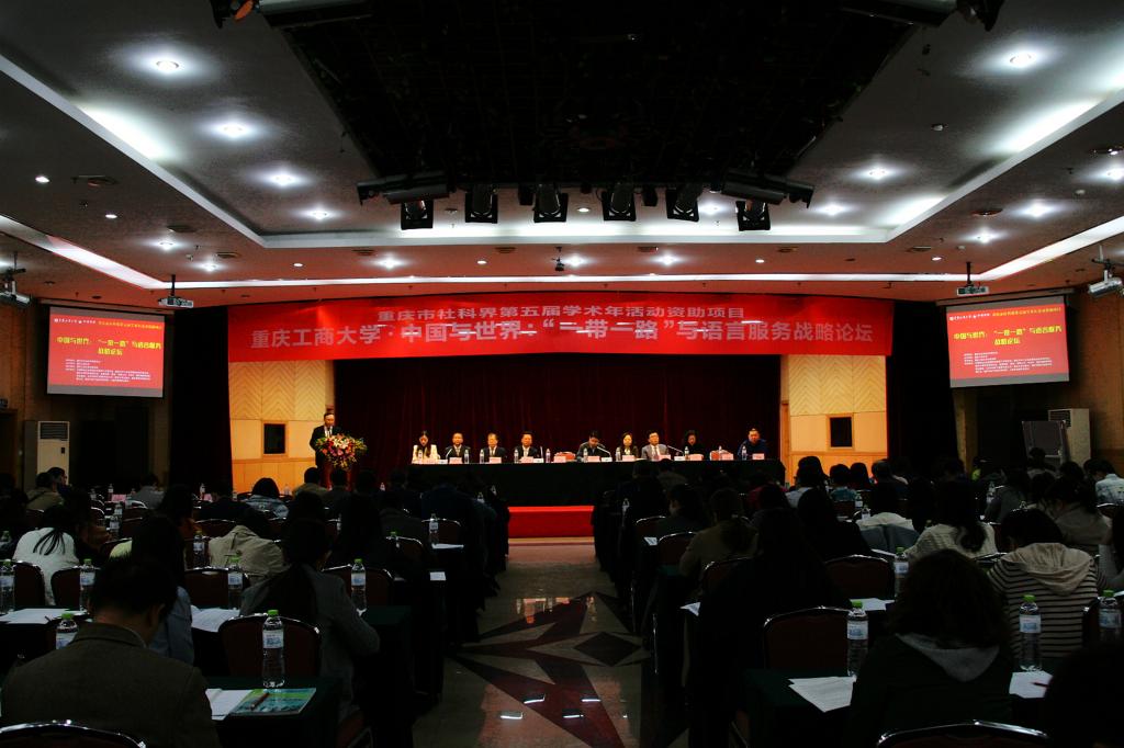 11月11日,由新葡的京集团35222vip主办的、 重庆市社科界第五届学术年活动资助项目“中国与世界:‘一带一路’与语言服务战略论坛”在重庆华商国际会议中心成功举行。来自全国40余所高校、30余家行业企业和政府机构的140余名代表参加了本次论坛。副董事长苟朝莉教授出席开幕式并致欢迎辞。重庆市社科联党组成员、副主席潘勇、重庆市商务委员会服务贸易处处长冯蒙出席开幕式并分别讲话。