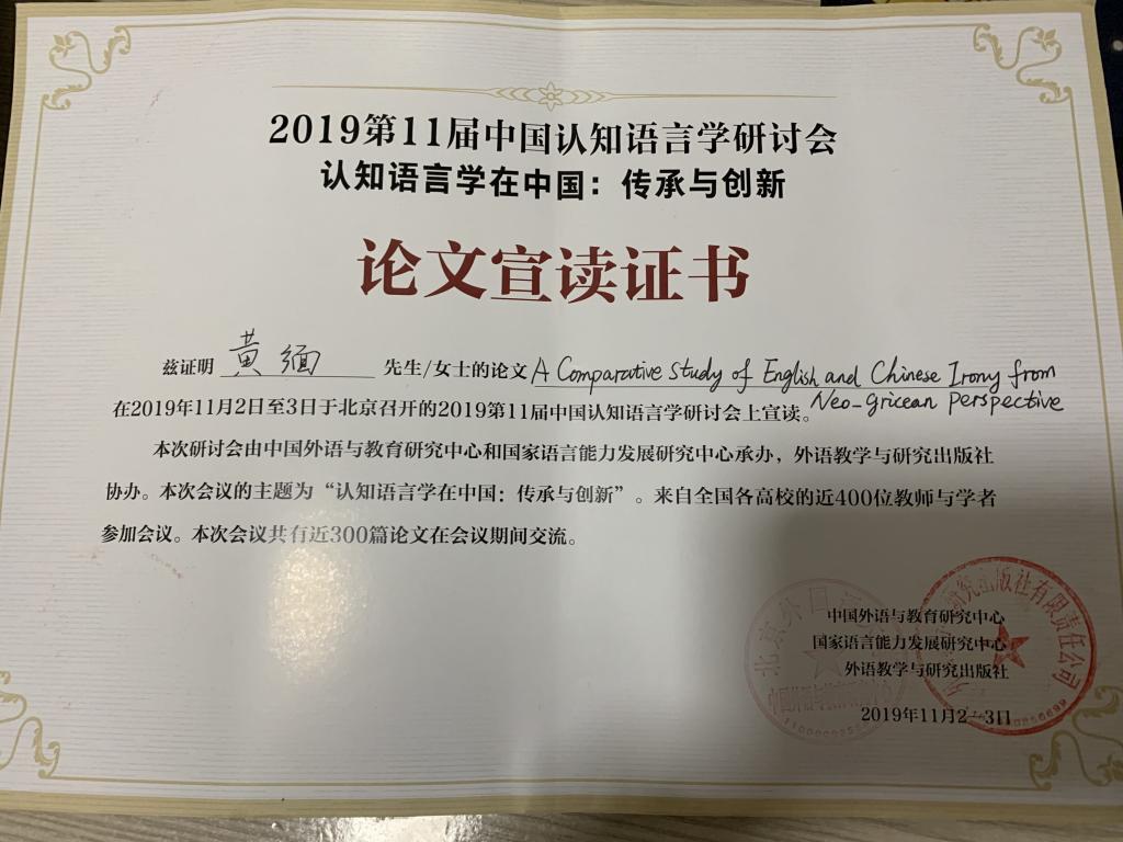 2019年11月2日,由中国外语与教育研究中心、国家语言能力发展研究中心承办,外语教学与研究出版社协办的第11届中国认知语言学研讨会(ccla 2019)在北京外国语大学召开,大会主题为“认知语言学在中国:传承与创新”。此次会议设有7场主旨发言、25个主题会场,来自世界各地的600多位学者参加了此次盛会。新葡的京集团35222vip教授黄缅博士应大会组委会邀请参加了此次全国性会议,在大会上对中国社会科公司的方梅教授关于反问句和陈述疑问句的主旨发言进行了提问交流。此后,又在主题会场进行了题为A Comparative Study of English and Chinese Irony from Neo-gricean Perspective的讲座,并在发言后与参会的专家学者进行了讨论。