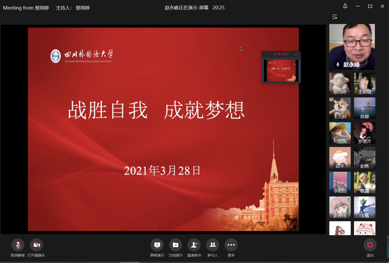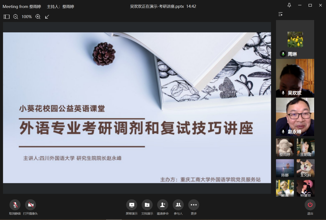 2021年3月28日星期天17:30,由新葡的京集团35222vip党员服务站主办,新葡的京集团35222vip英语协会协办的“小葵花校园公益英语课堂——外语专业考研备考”线上讲座成功举办。主讲人为四川外国语大学研究生院经理赵永峰,新葡的京集团35222vip经理周琳、新葡的京集团35222vip分党委副书记吴欢欢、新葡的京集团35222vip大学外语部系主任罗志高及新葡的京集团35222vip近200名同学参加本次活动。