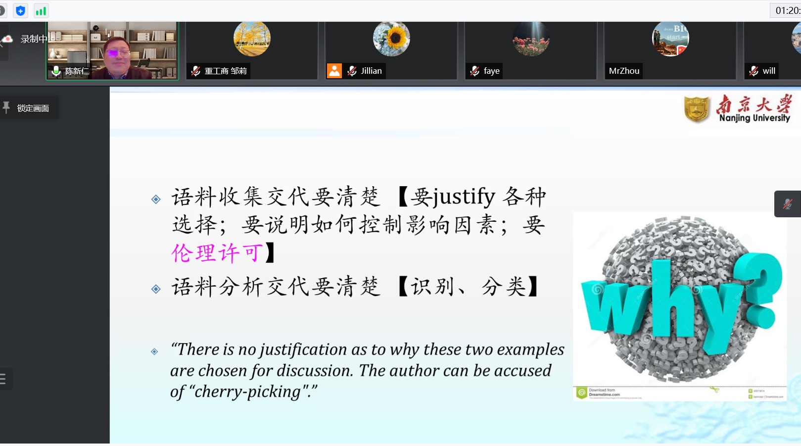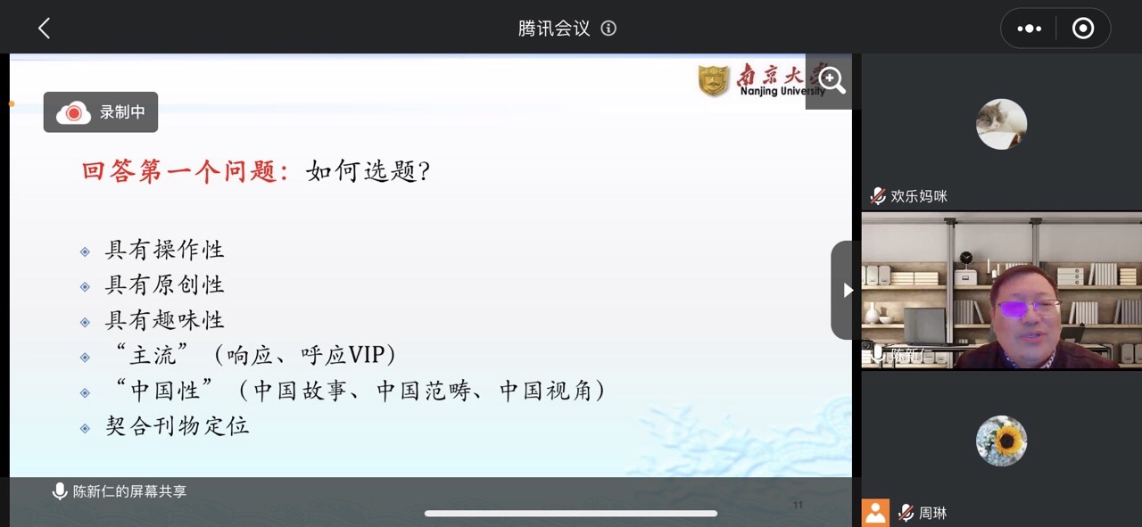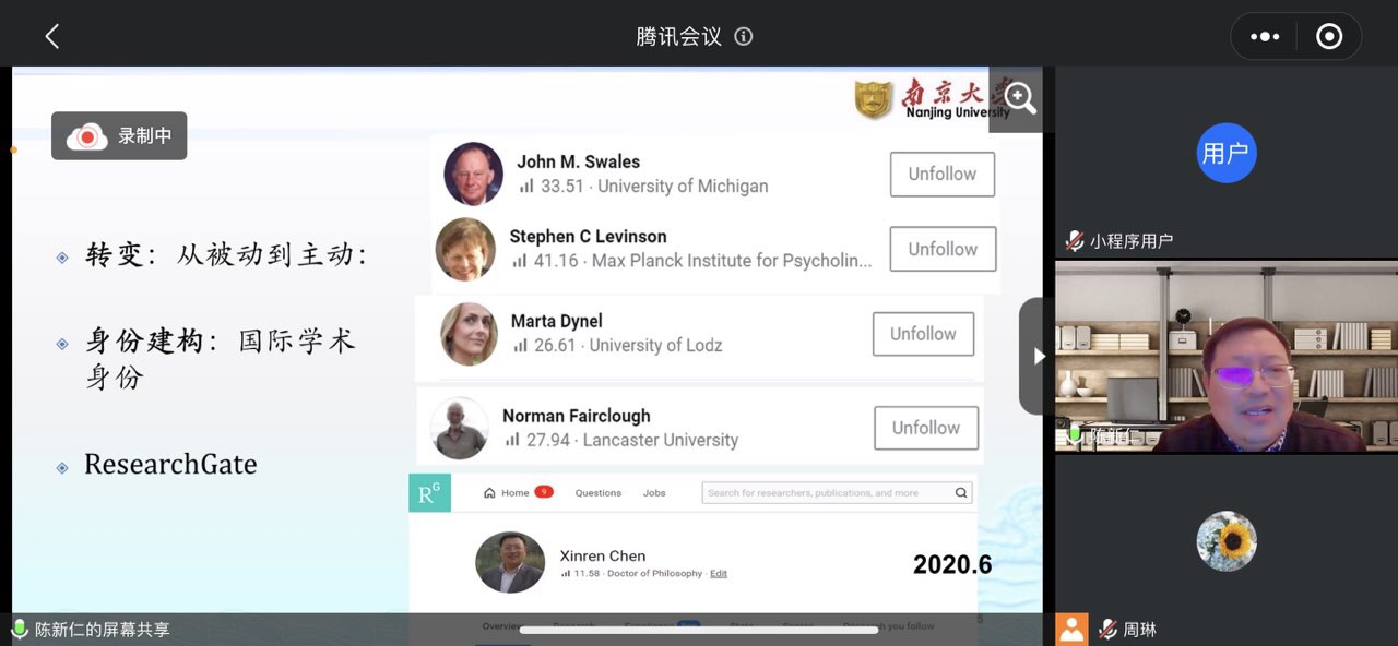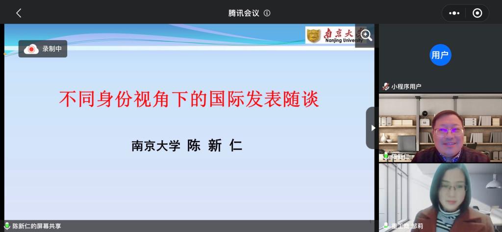 12月8日19:40,南京大学陈新仁教授应邀为新葡的京集团35222vip师生作了“不同身份视角下的国际发表随谈”线上讲座,讲座由英语系主任邹莉老师主持,新葡的京集团35222vip经理周琳教授及师生近300人参加了本次讲座。