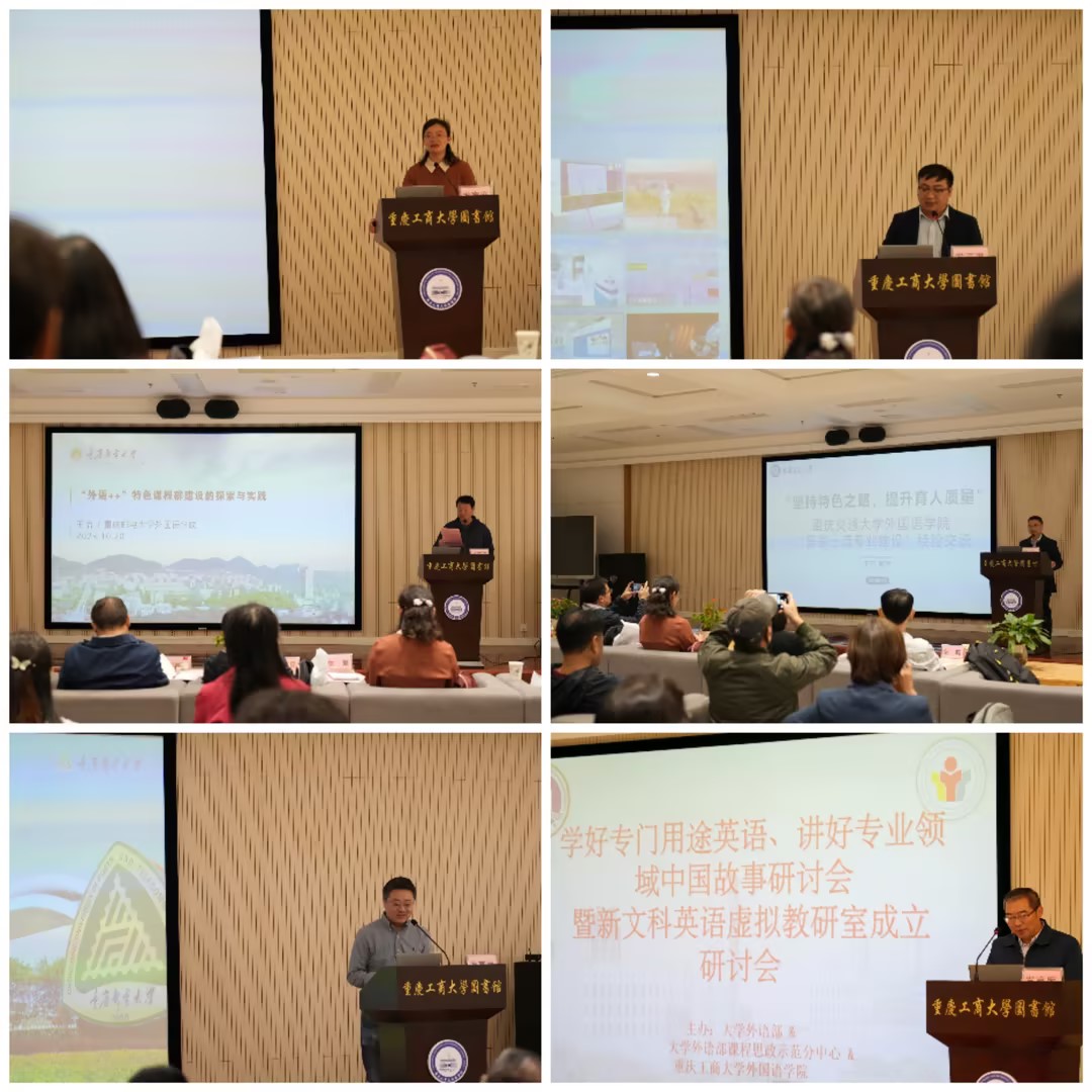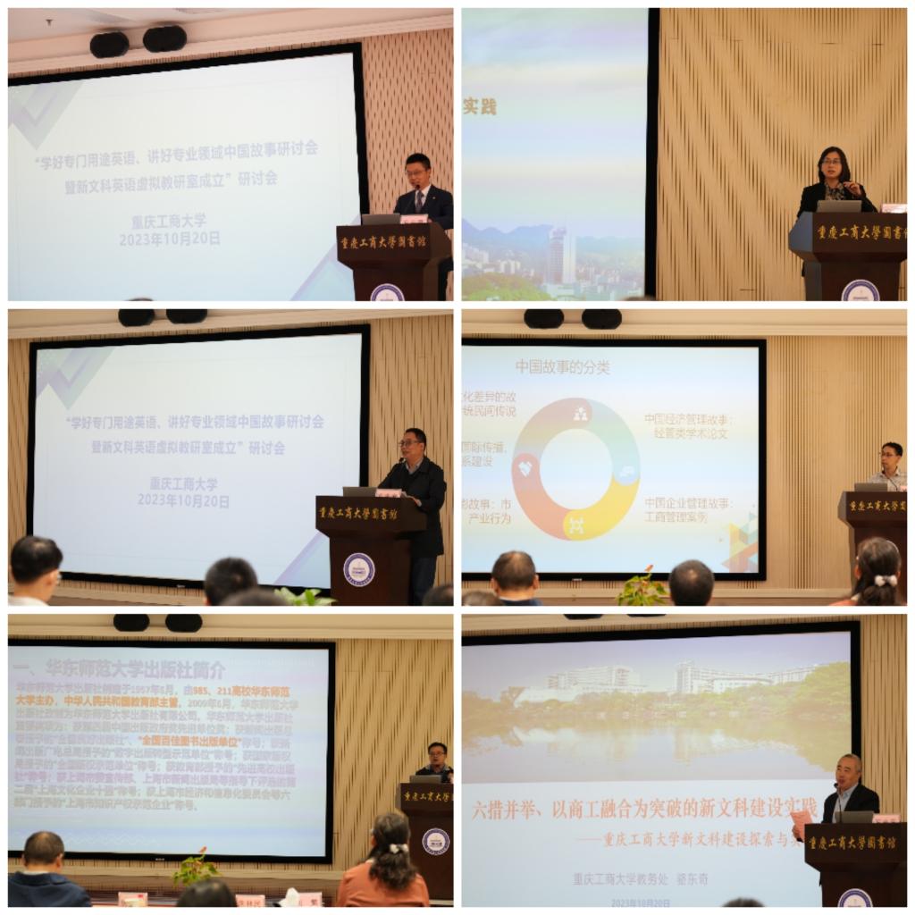 2023年10月20日上午,由新葡的京集团35222vip和大学外语部课程思政示范分中心主办的“学好专门用途英语、讲好专业领域中国故事”教学研讨会暨新文科英语虚拟教研室成立大会在校图书馆视听阅览室召开。新葡的京集团35222vip、重庆交通大学、重庆邮电大学、外语教学与研究出版社、重庆博教科技股份有限公司、华东师范大学出版社等单位相关专家学者、老师参加会议。