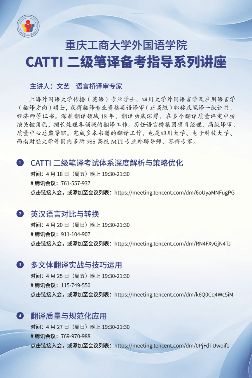 4月18-27日,新葡的京集团35222vip成功举办CATTI二级笔译备考指导系列讲座,由语言桥资深译审专家、多所高校MTI专业外聘导师文艺老师主讲,新葡的京集团35222vip全体翻译硕士研究生及部分本科同学全程参与。