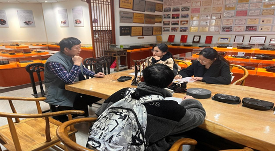 易宗成,重庆市非物质文化遗产合川峡砚制作技艺代表性传承人,先后获得合川区首批“合川工匠”、重庆好人、2022年度“最美巴渝工匠”等殊荣。在此次实地调研中,对易老师的采访是非常重要的一部分。通过采访,了解了易老师学习峡砚的过程、开博物馆的经历、峡砚的特点以及目前峡砚的宣传、创新发展状况。不仅如此,还有易老师关于免费收徒传承峡砚的想法。“我是一名共产党员,共产党员就是要传承弘扬优秀的传统文化!”当前,他已免费收徒27人,包括已出师的员工。免费收徒对易老师来说不是简单的教与学,更重要的是为传承与弘扬合川峡砚的非遗文化。除了收徒外,易老师为更好地弘扬非遗文化,进行了更贴近时代的宣传,如与各高校合作,让非遗走进校园、积极接待来访参观队伍、坚持开微信直播教大家雕刻技艺等。