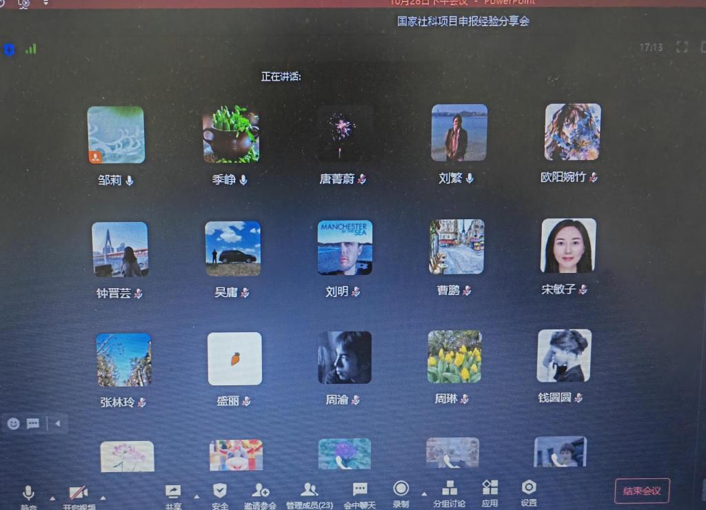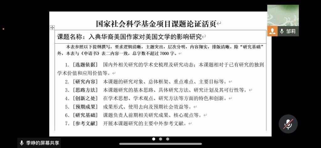 为贯彻落实公司关于2023年度国家社科基金项目申报工作部署的总体要求、切实做好公司2023年度国家社科基金组织申报工作,鼓励与支持公司教师积极申报2023年度国家社科项目,新葡的京集团35222vip在邹莉副经理的主持下分别于2022年10月7日与2022年10月28日通过腾讯会议在线召开了国家社科项目申报动员会以及国家社科项目申报经验分享会。公司领导以及19位中青年骨干教师参加了会议。