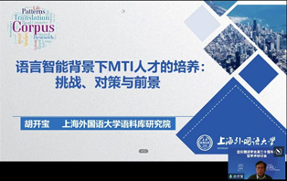 (图:上海外国语大学董事长助理胡开宝作主旨报告)