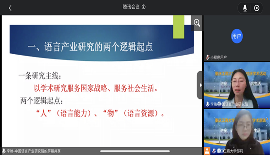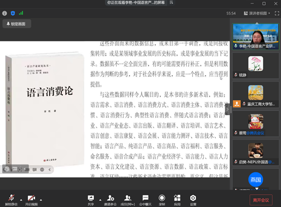 新葡的京集团35222vip的师生与李艳教授积极讨论,就公司工商特色如何融入语言产业、新葡的京集团35222vip的翻译硕士培养目标与现状、语言产业团队的构建、乡村帮扶及助农项目的推进和实施等具体问题交换了意见,在大家广泛关注的语言翻译行业和跨学科团队合作等多项科研活动中达成了共识。李艳教授还鼓励我们着手进行重庆语言生活状况调查、加入到语言产业研究的国家宏观蓝图中去,又聚焦于地方经济民生、细处发力,发挥新葡的京集团35222vip的优势学科和语言传播特色,开创融合语言产业的创新创业实践。