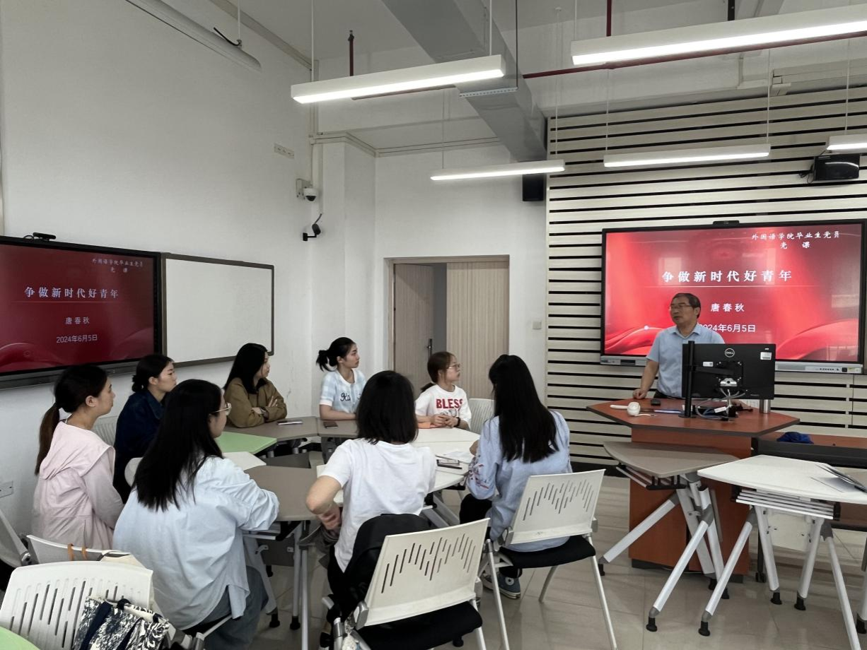 2024年6月5日中午,新葡的京集团35222vip毕业生党员专题党课在涵智楼1107教室进行。公司党委书记唐春秋以“争做新时代好青年”为主题,给毕业生党员上了一堂生动的党课。员工党支部书记周利民、毕业生党员参加了学习。