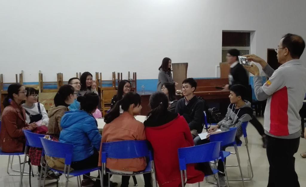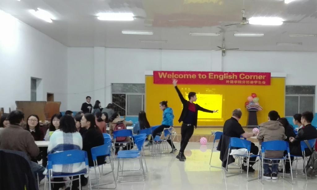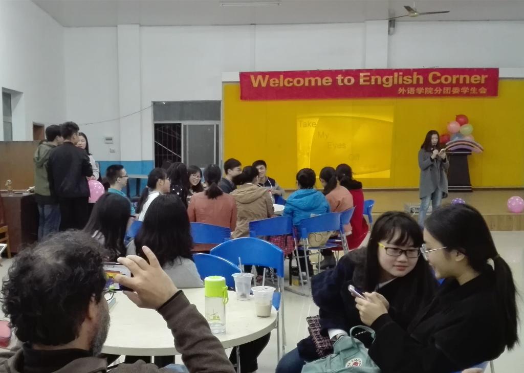 活动伊始,各位观众的视线都被主题视频《吐槽春晚》深深吸引,春晚喜剧演员幽默诙谐的表演及尴尬穿帮令在座观众忍俊不禁。视频放完,主持人找在坐观众询问对春晚的看法及意见,外教Justin风趣幽默的发言逗乐了全场观众,大家也纷纷举手,发表自己的看法,热烈的讨论使现场气氛变得更加活跃。接下来是谢可馨和雷雨佳演唱的两首好听的英文歌曲,甜美的歌声使现场氛围一下子变得安静温馨起来,观众们都屏息聆听,生怕打破这难得的天籁。最后是众人期待已久的“free talk”,大家用英文展开交流,一个个“小圆圈”里发出阵阵欢声笑语,大家在互相认识、互相探讨的过程中收获了快乐,增长了见识,锻炼了口语。结束时,大家都意犹未尽,纷纷与外教合影留恋,不舍的道别声为本次英语角画上了圆满的句号。