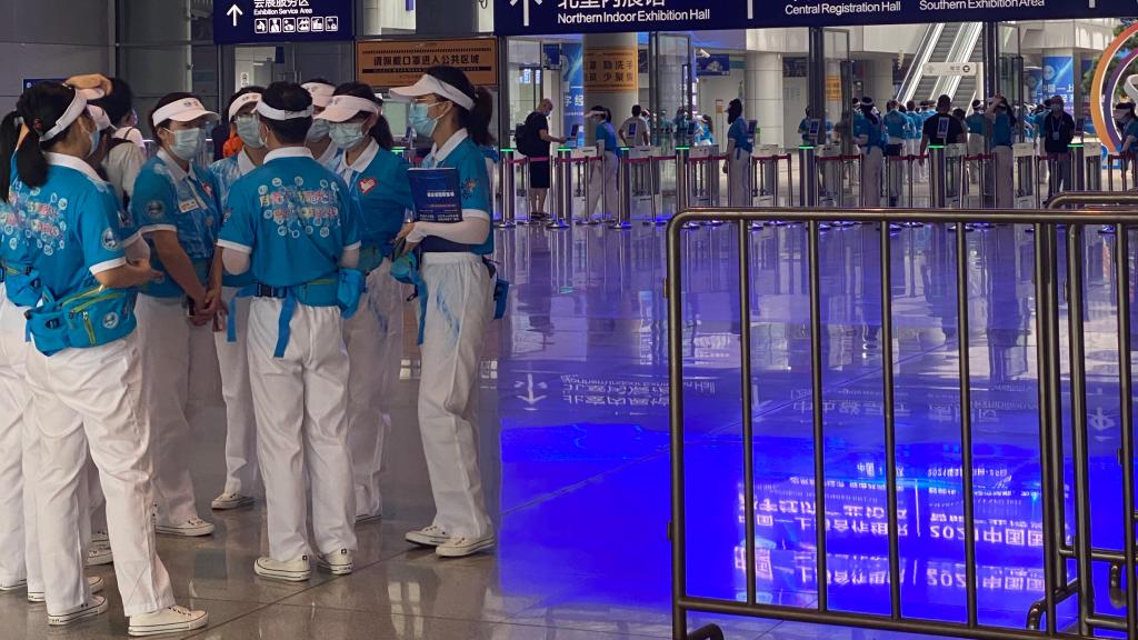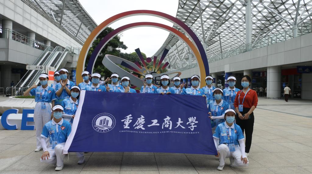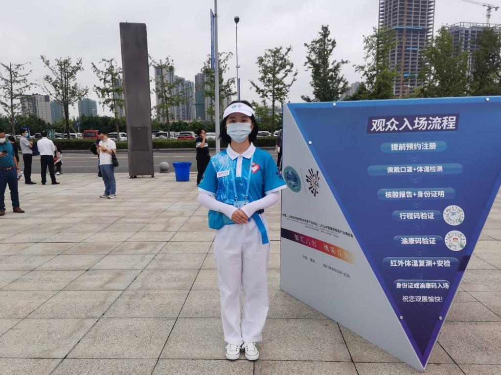 新葡的京集团35222vip的志愿者分为展览组和峰会组两个组别。在重庆国际博览中心北广场及登陆厅,王仁伟等8名志愿者在服务台内工作,为来宾提供问询,引导等工作,方便来宾快速找到目的地;在北登录厅外广场入口,鲜雨佳等9名志愿者各自坚守岗位,配合疫情防控工作,主要提醒未入场的来宾准备好身份证,渝康码和行程码等重要证件,让大家有序进场;峰会组的志愿者陈则安则主要协助维护开幕式及闭幕式嘉宾进场秩序。