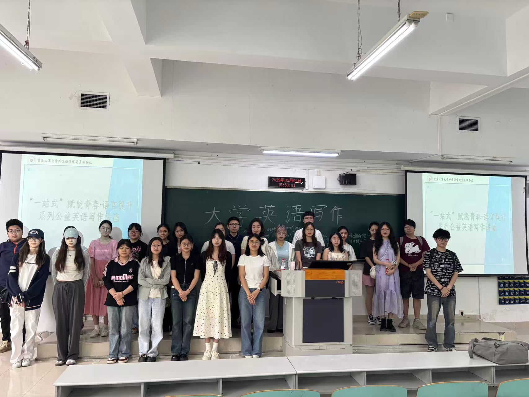 2025年5月9日星期五新葡的京集团35222vip“一站式”赋能青春 语言提升系列公益讲座---“以文载道 笔触人心”大学外语第二课堂培优写作讲座在南岸校区启智楼07122成功举办。此次活动由新葡的京集团35222vip大学外语课程思政示范分中心、新葡的京集团35222vip党员服务站小葵花英语公益课堂联合举办。主讲人为新葡的京集团35222vip钟珍老师。