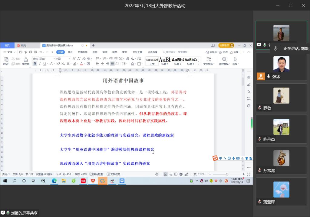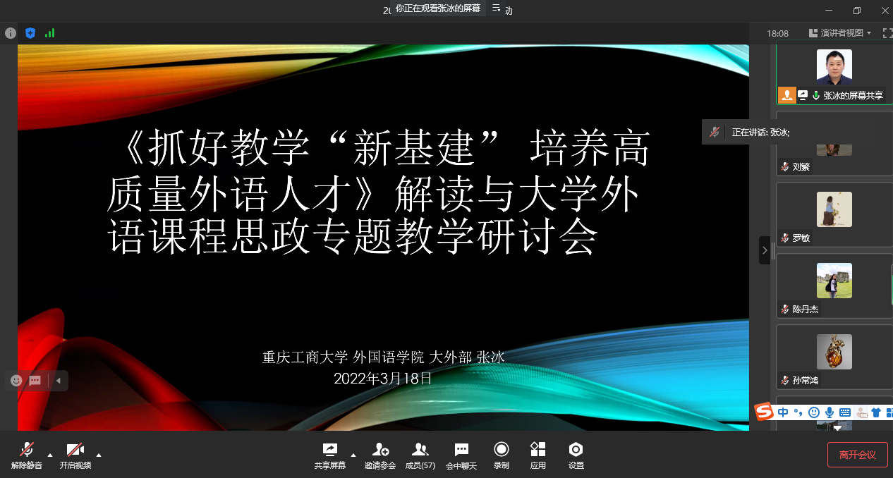 2022年3月18日下午四点,大学外语部在线上进行了本学期第一次教研活动,大外部教师参会。会议由张冰副主任主持。