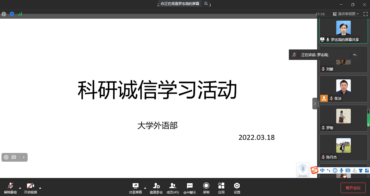 首先,罗志高主任带领大家进行了科研诚信学习活动,他简要介绍了科研诚信学习活动开展的背景,与大家分享了四川某高校万XX等出版的专著《材料仿生与思维创新》学术不端案例。通过这个案例给大家介绍了学术不端包含的十二种常见行为。然后带领大家学习了《新葡的京集团35222vip学术不端行为处理办法》。罗主任结合大外部科研和教学实际情况,给大家做了《外语老师与科研诚信》分享,内容涵盖:为什么做科研、如何做科研、从哪里入手、如何模仿与创新、如何应用与创新、再深入科学研究等。