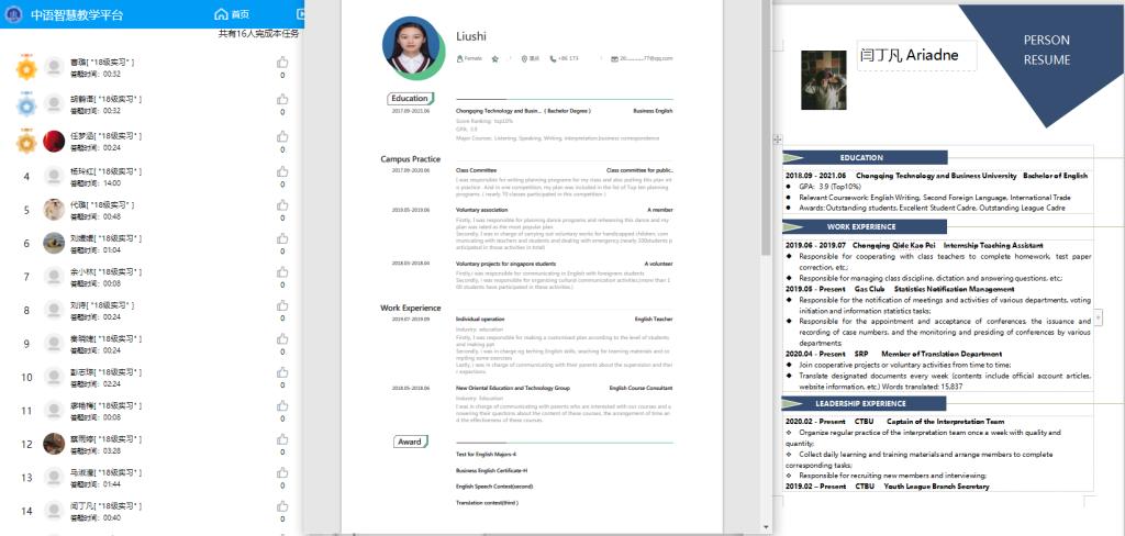 整个实习过程中,同学们严格遵守实习纪律,做到了有条不紊,循序渐进。每位同学都充分把握机会,体验数字化、移动化、智能化的线上实习带来的便利,把企业方提供的外贸业务员、外语职场能力体验师和语言能力体验师等实习岗位当成真正的职场角色来看待,实习任务完成率高达95%。