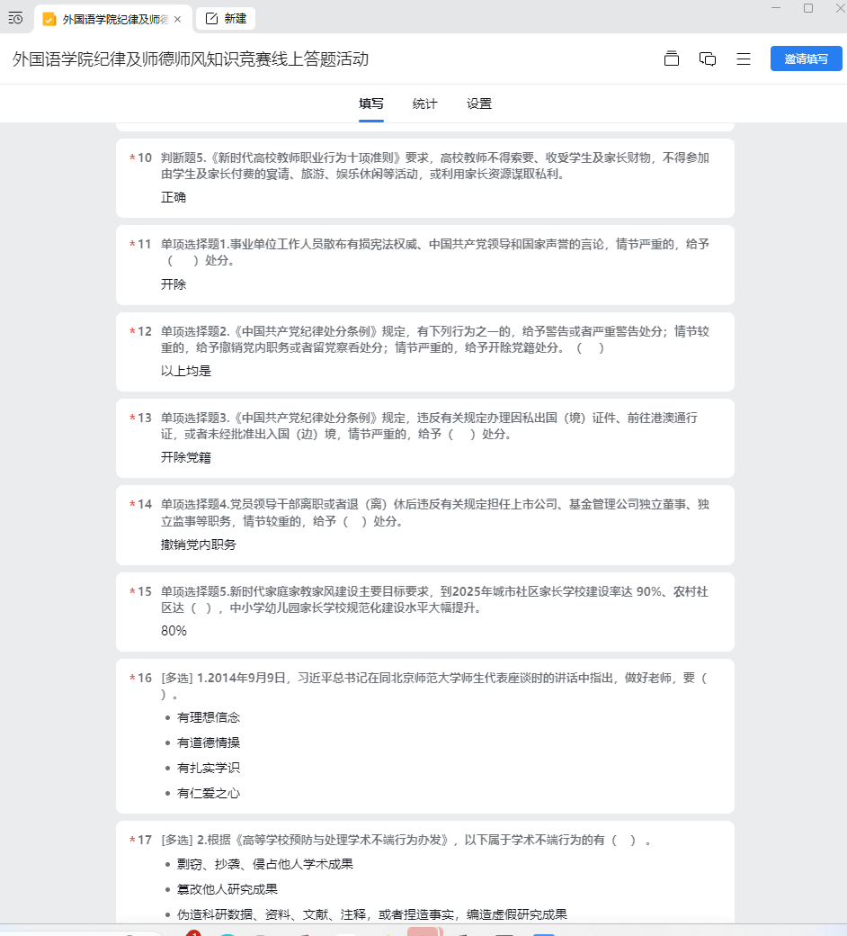 本次竞赛采取企业微信线上答题的形式。竞赛试题覆盖《中国共产党纪律处分条例》《事业单位工作人员处分规定》《关于进一步加强家庭家教家风建设的实施意见》《新时代高校教师职业行为十项准则》《高等公司预防与处理学术不端行为办法》以及习近平总书记关于教育的重要论述等内容,分填空题、判断题、单项选择题和多项选择题四种题型,共20道题目。