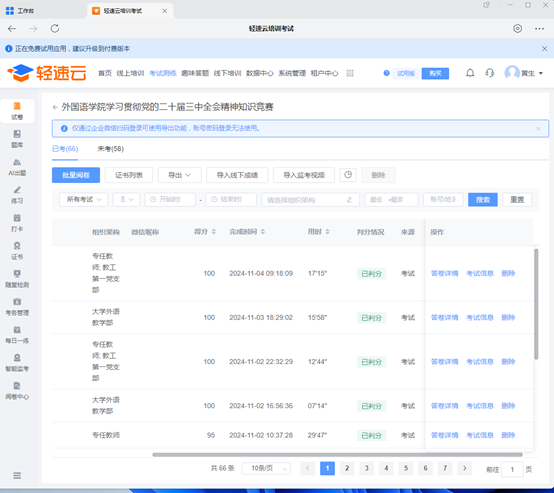 此次知识竞赛采取网上答题的形式进行,共66人参与活动。赛前,公司工会组织人员围绕《中国共产党第二十届中央委员会第三次全体会议公报》《中共中央关于进一步全面深化改革推进中国式现代化的决定》和习近平总书记《关于<中共中央关于进一步全面深化改革、推进中国式现代化的决定>的说明》等文件内容命题,建立试题库。试题库分填空题、单项选择题和多项选择题三种题型,每种题型各30道小题。每位参赛人员的试卷从试题库中随机抽提20道小题组成,其中,填空题5道、单项选择题7道、多项选择题8道。