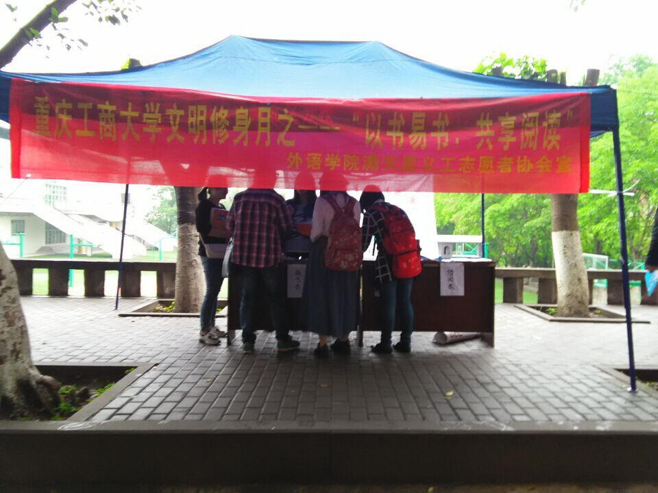 4月23日为世界读书日,今年三月李克强总理在政府工作报告中首次写入倡导全民阅读的内容。2015年4月23日上午10:00,伴随着细雨,新葡的京集团35222vip文明修身月之“以书易书,共享阅读”活动在香樟林旁正式举行。此次活动由新葡的京集团35222vip满天星义工志愿者协会主办。活动不仅响应了“文明修身”的号召,更打破了传统爱心募捐的模式,让图书资源得到了更好的利用。