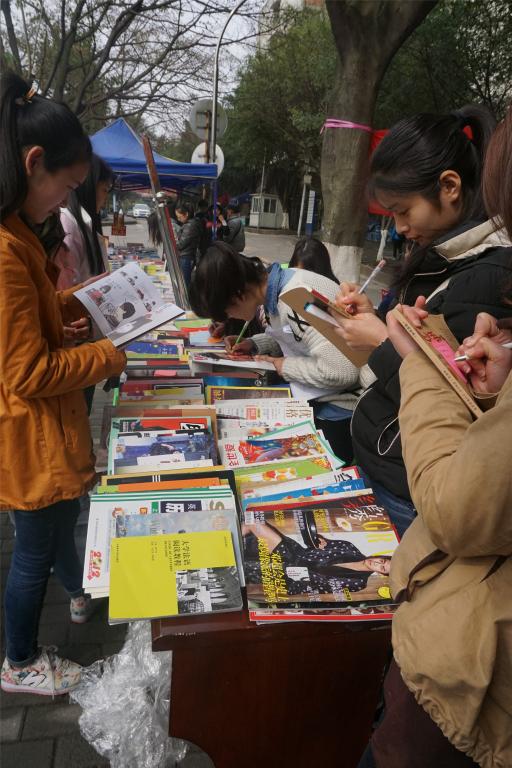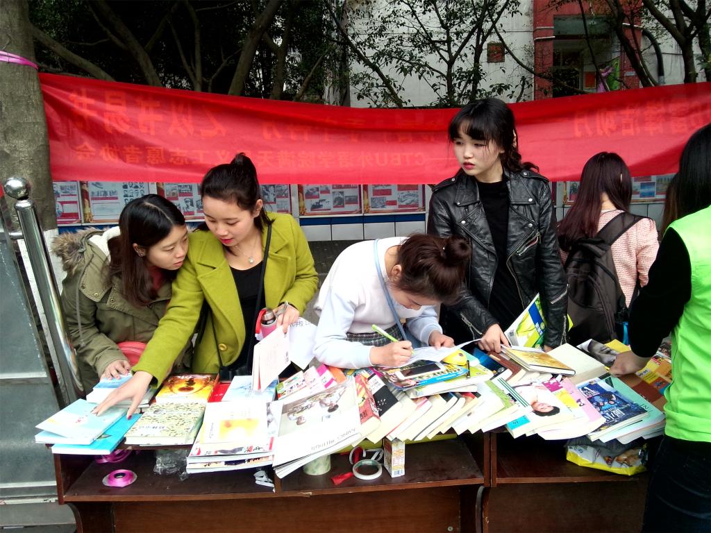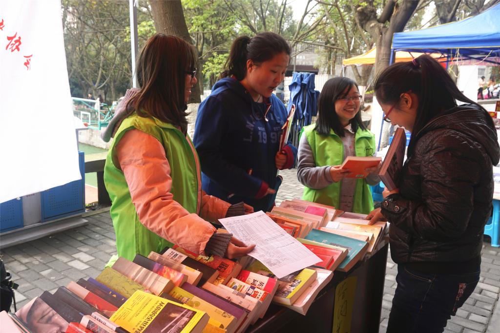 经过近两小时的场地布置,活动于11日14:00正式开始。活动开始前,所有书籍被分为交换、借阅、免费赠送三大板块。由于活动形式新颖,一开始便吸引了众多同学的目光,他们主动向工作人员询问问题,部长和干事们也十分耐心地为他们答疑解惑。了解到这次活动的主题内容后,越来越多的同学加入到以书易书的阵营中来,他们不仅积极地同工作人员交换书籍,同时也向大家分享了自己阅读的心得和故事。12日上午,一位来校散步的准妈妈听说有此活动也积极参与其中。经过简单的易书工作后,工作人员赠送给了这位准妈妈两本养生杂志作为未出生小宝宝的“见面礼”,希望宝宝能够健康快乐的成长。“一人有一本书,交换之后他便拥有了两本书”,一位参与者兴奋地说道。言语通俗易懂却细思深刻,其中不仅有获得知识的喜悦,更有对活动的莫大赞许和肯定。