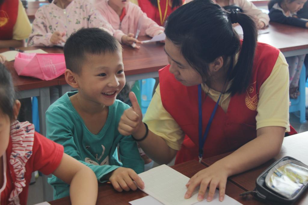 启动仪式结束后,在随后的生活安全防范课堂以及独具学科特色的奇妙英语之旅中,孩子们情绪高昂,积极参与,现场气氛热烈。志愿者们采取了讲授与动作示范相结合的方法,惟妙惟肖将课本上的内容展示的淋漓尽致,小朋友们也热情的参与到与志愿者的互动之中来。休息时间,各位志愿者与小朋友们进行了舞蹈才艺的PK,彼此间的感情也在进一步加深。