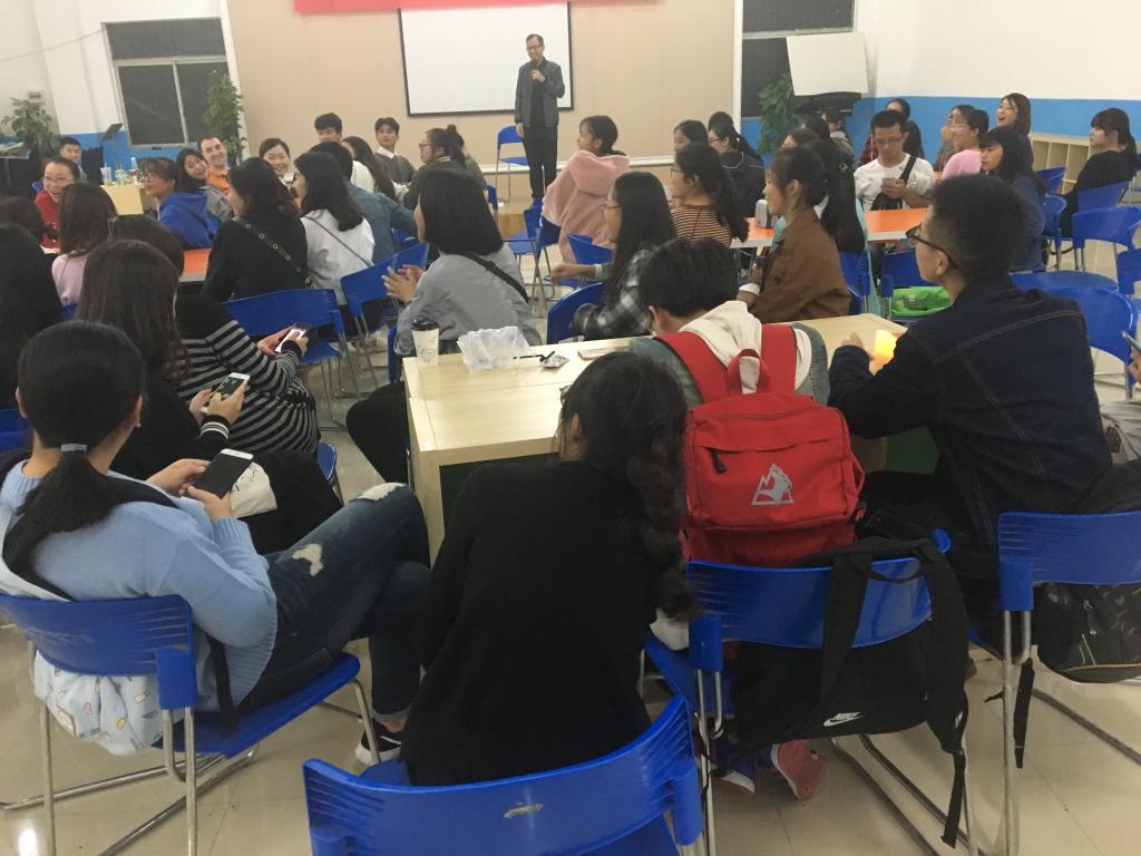 活动还未开始,现场闪烁的电子蜡烛和砰砰的敲打声就已经让同学们提前融入到了万圣节紧张刺激的氛围当中。灯光逐渐暗下,只见Brittany老师手持电子蜡烛走上舞台,面带神秘地为同学们讲述自己的万圣经历。讲到高潮时,她更会用形象生动的语气和表情来引得同学们尖叫连连。接着,来自泰国的Sam老师也为大家分享了关于万圣节的故事,同学们在聆听中深深地感受到了来自这个神秘国度的独特魅力。Free talk环节,同学们相互分享着自己的亲身经历,欢呼声、尖叫声久久回荡在会场之中。尽管开场前许多同学对万圣节的认知还仅仅停留在面具和装扮上,但经过了将近一个小时的密切交流后,大家对这个节日的起源、习俗、演变和饮食等方面也有更加深刻的了解。
