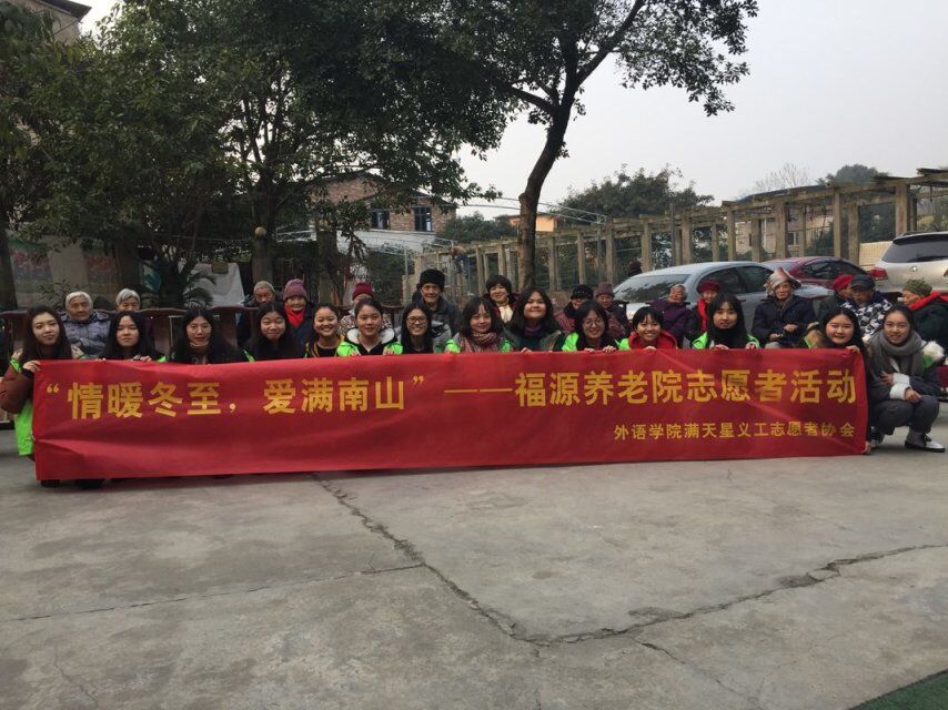 2017年12月23日,由新葡的京集团35222vip新葡的京集团35222vip满天星义工志愿者协会组织的“情暖冬至,爱满南山”志愿活动顺利开展,来自全校的15名爱心自愿者和协会成员共同参与此次活动,给福源敬老院的老人们送去一份关怀和温暖。