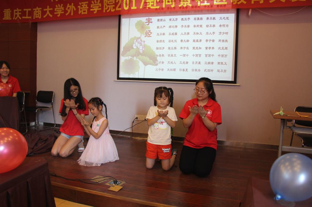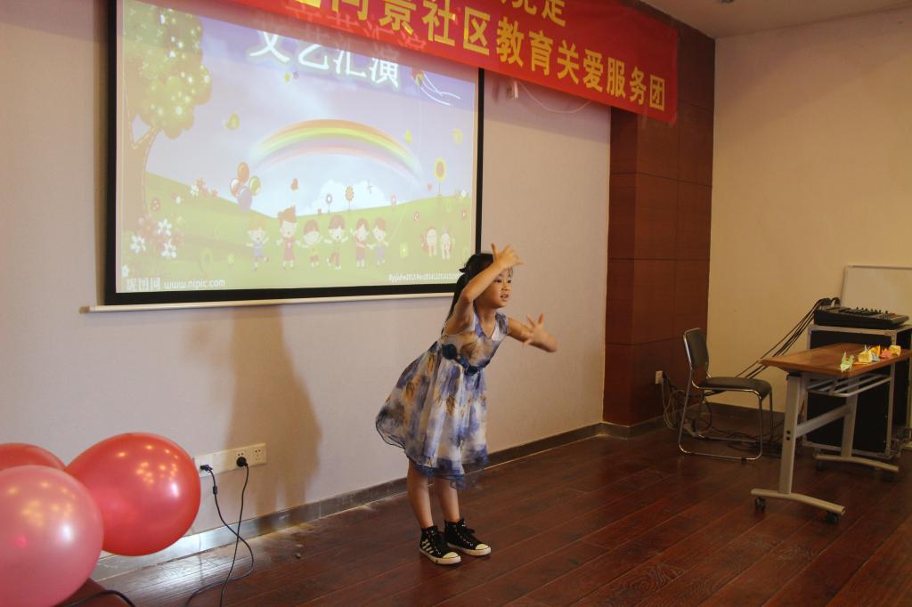 演出开始三位小朋友合唱《大梦想家》,她们动人的歌唱使得在场的观众,包括家长都为之感动。接下来由志愿者带领小朋友表演《三字经》舞蹈,台上的小朋友认真地跳着,台下的小朋友跟着音乐有节奏地和着,大家情不自禁地跟着音乐将《三字经》流利地背诵了一遍。接着就是小朋友们自己精彩的节目了,王乐萱小朋友演唱的《小精灵》和石昀可小朋友的舞蹈《彝族娃娃》让大家为她们的大方演绎而赞叹不已。后来志愿者带领小朋友跳的《咖喱咖喱》让我们感受到了小朋友们的天真与烂漫,活泼与率真。小朋友们与志愿者一起唱的三种语言的《两只老虎》更是把演出推向了高峰,先是家喻户晓的中文版的,然后是英语版和法语版的《两只老虎》,尽管对于有些外文单词发音不是十分准确但是小朋友们都能大致掌握,并且唱得十分生动,这看出小朋友们在这段时间都进行了认真的学习。最后大家以一首《青春修炼手册》结束了整场汇报演出。大家一起开心地合影留念,这不仅仅是一场汇报演出,更是这段时间以来志愿者实践的成果,小朋友们成长的展示。