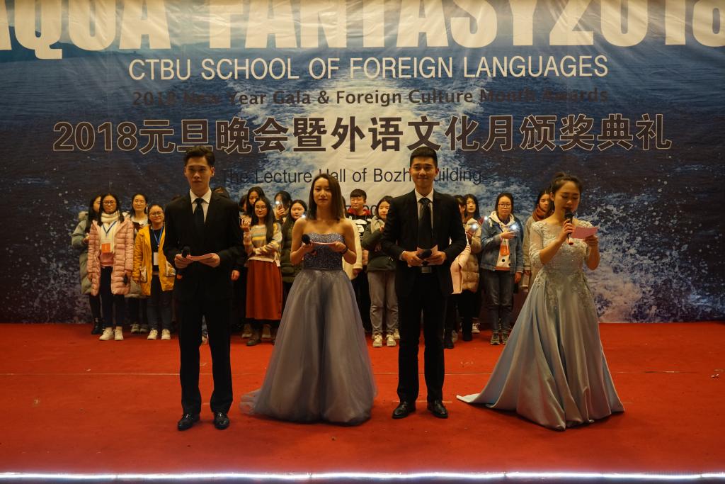 2017年12月30日晚18点30分,由新葡的京集团35222vip新葡的京集团35222vip主办、新葡的京集团35222vip分团委员工会承办的2018年元旦晚会暨外语文化月颁奖典礼在南岸主校区7100报告厅成功举办。新葡的京集团35222vip新葡的京集团35222vip副经理周琳教授、公司党总支陆嘉书记、新葡的京集团35222vip英语系主任邹莉老师、外教Jonathan受邀出席晚会,全校各兄弟组织主席团也受邀参与了此次活动。