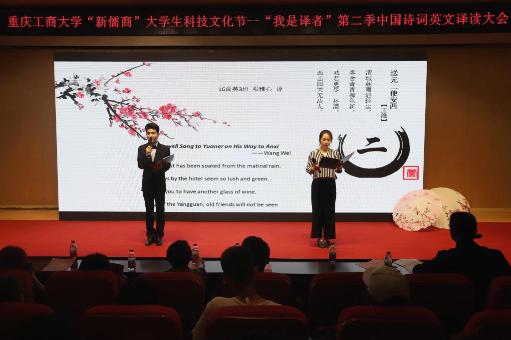 诗词是连绵千里不断的烽垛、是璀璨中华文明的瑰宝。晚会伊始,一段视频将中华诗词艺术与外语语言艺术碰撞出的璀璨火花带到活动现场,拉开晚会序幕。同学们再次化身“译者”,为现场观众带来了中国经典诗词的中英文译读,并以饱满的情感、流畅的表达使观众深深沉浸在含蓄诗词与欢脱的英文之中。一首首诗词是一声声来自灵魂的高歌,是发自内心的低吟:《江南春》的沧桑慨叹;《送元二使安西》的眷恋深沉;《独语》的深情细腻;《雨巷》的缠绵哀怨;《黄鹤楼送孟浩然之广陵》的恢弘怅然;《卜算子·我住长江头》的脉脉相思;《热爱生命》的热烈高亢,无一不让观众为之沉醉。译读大会现场还设置了精彩绝伦的“沙画猜诗”和“飞花令”环节,让现场同学亲身体会吟罢意犹浓,诵过思更深的情怀。受《经典咏流传》启发,晚会新增古诗词演唱环节,一首旋律如诗一般的民谣《声律启蒙》体现出诗词声调、音律、格律与曲调的完美结合;与此同时,译读大会延续了“我是译者”第一季中向首位获国际翻译界最高奖项之一的“北极光”杰出文学翻译奖的亚洲人许渊冲老先生致敬的环节,两位同学声情并茂地朗读了苏轼的《江城子·密州出猎》 和许渊冲老先生的同名翻译作品,气势磅礴、震撼人心。中华古文明,国粹尽传承。诗寄山水情,词写人世真。百人竞歌咏,佳句绕梁音。“我是译者”中国诗词英文译读大会举办以来,就引发了全校同学对中华传统文化和英语学习的热爱和追随。“我是译者”第二季经过四个月的比赛、选拔和筹备,主办方从200余份入围作品中评选出公外组与专业组一二三等奖,共20个作品,评委和嘉宾在现场为获奖作品的作者颁发了奖状,活动也在现场观众热烈的掌声中落下了帷幕。