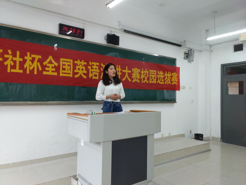 此次比赛以“Stones”为话题,在主持人简短而流畅的介绍后,第一位选手登台演讲。她出色的口语能力以及应变能力为本次比赛开了一个好头,更增加了比赛的看点。随后的选手们更是各显神通,每个人都展现出他们最出彩的一面。整个比赛过程不仅秩序井然,而且高潮迭涌。在紧张激烈的角逐中,选手以他们清晰的发音,自然的表达,娴熟的技巧和自信的微笑表达了他们对英语的热爱,同时也展现出他们为此所做出的努力以及自身强大的实力。他们神态自然,声情并茂,不仅有与观众进行亲密互动,还大方地用热烈的掌声表达他们对竞争对手们的支持和鼓励,现场气氛十分热烈,这也促使了比赛的顺利举行。