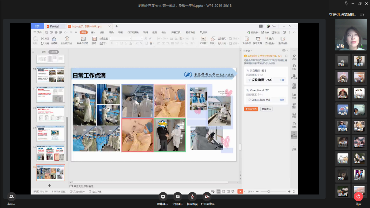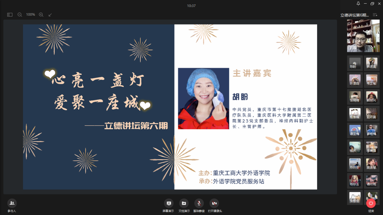 2020年4月17日晚,公司党员服务站立德讲坛第六期——“心亮一盏灯,爱聚一座城”线上分享活动在企业微信群成功举办。此次活动特别邀请到重庆市第17批援湖北医疗队队员、重庆医科大学附属第二医院第23党支部委员、神经内科主管护师胡盼副护士长作为主讲嘉宾。公司党总支书记陈晓东、党总支副书记程亚以及来自全校不同公司100余名师生参与了本次活动,本次活动由公司党员服务站指导老师丁亮主持。