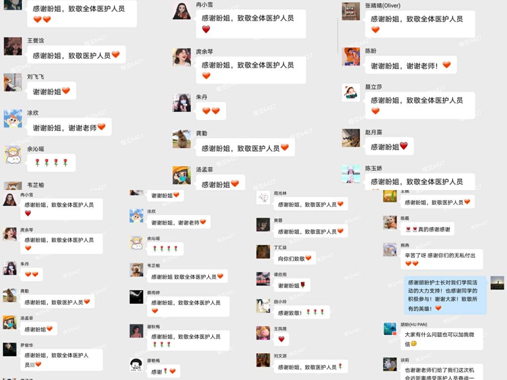 在互动环节,同学们争先恐后与胡盼护士长连线,对胡盼护士长及全体医护人员表达最真诚的感谢与敬佩。其中,新葡的京集团35222vip16级法语专业李美玲同学饱含深情地为胡盼护士长及所有抗“疫”医护人员朗读了她亲笔写的《献给广大奋斗在一线的医护人员的一封信》。听了同学们的发言,胡盼护士长满怀感动,她为同学们在疫情爆发期间能够严于律己点赞,她希望通过这次抗击疫情,同学们能够更加正确地认识自己的国家,公正地看待医护工作者,立足现实,增强自己的本领,在祖国需要我们的时候能敢于担当,挺身而出。