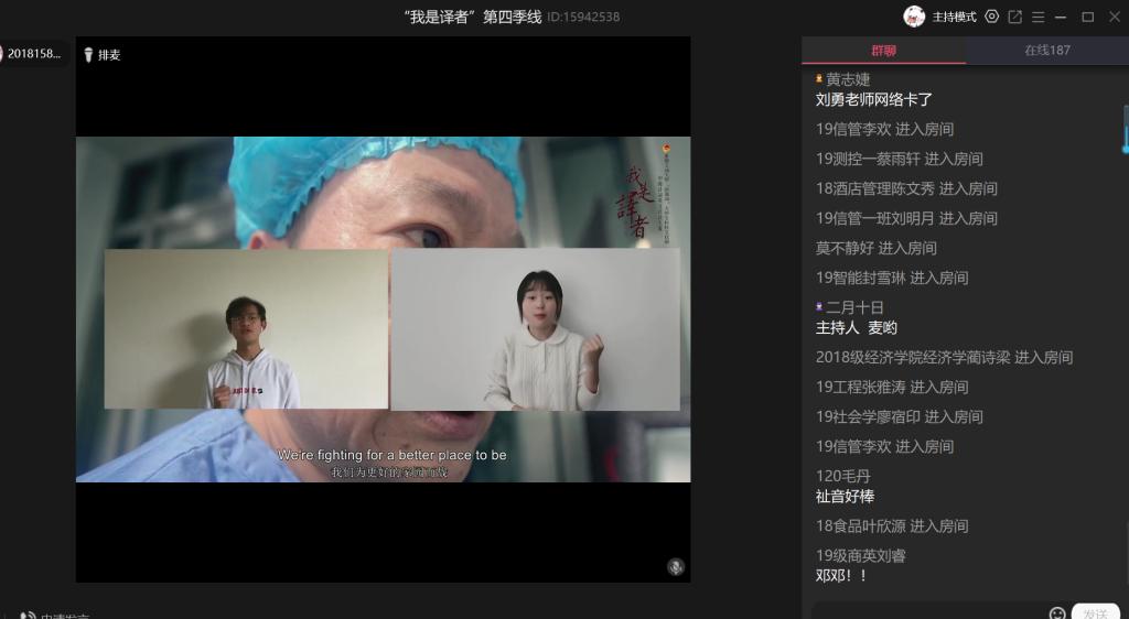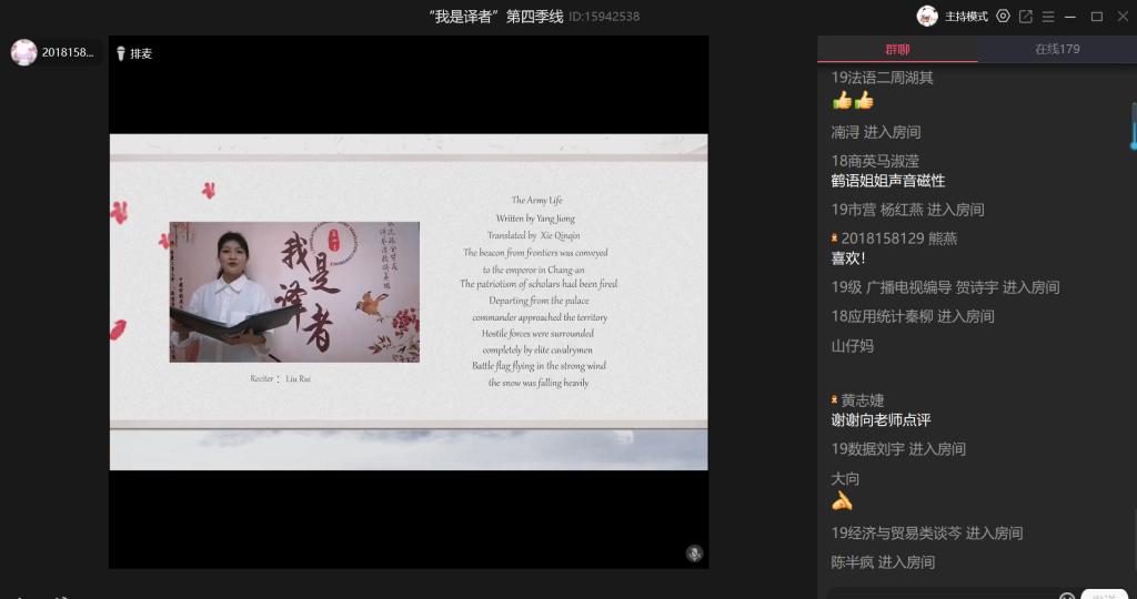 “我是译者”活动自2017年至今已连续开展四季,本次活动共收到全校各专业同学的作品三百余份,最终评选出获奖作品24份。活动伊始,开场视频向观众们呈现了数百年来为中华民族独立、为新中国建设而做出贡献的英雄们,有“砍头不要紧,只要主义真”的夏明翰;有四川木里火灾救援牺牲的消防战士;有抗击新冠肺炎疫情的医护人员……本次活动意通过诗词表达对英雄的歌颂和赞美。