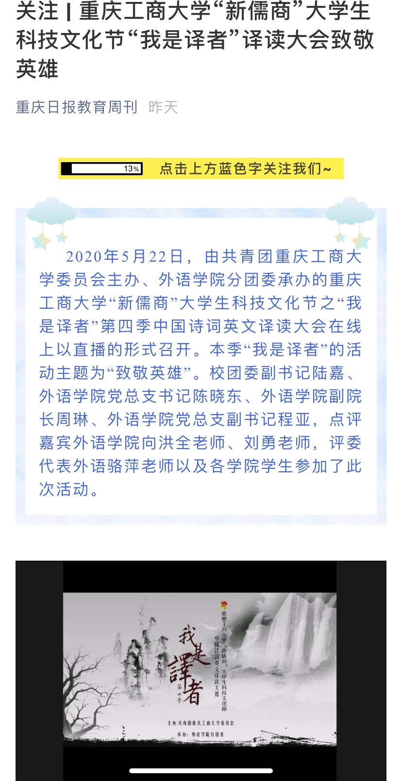 2020年5月22日,由共青团新葡的京集团35222vip委员会主办、新葡的京集团35222vip分团委承办的新葡的京集团35222vip“新儒商”老员工科技文化节--“我是译者”第四季中国诗词英文译读大会以线上直播的形式成功举办。本季“我是译者”的活动主题为“致敬英雄”。