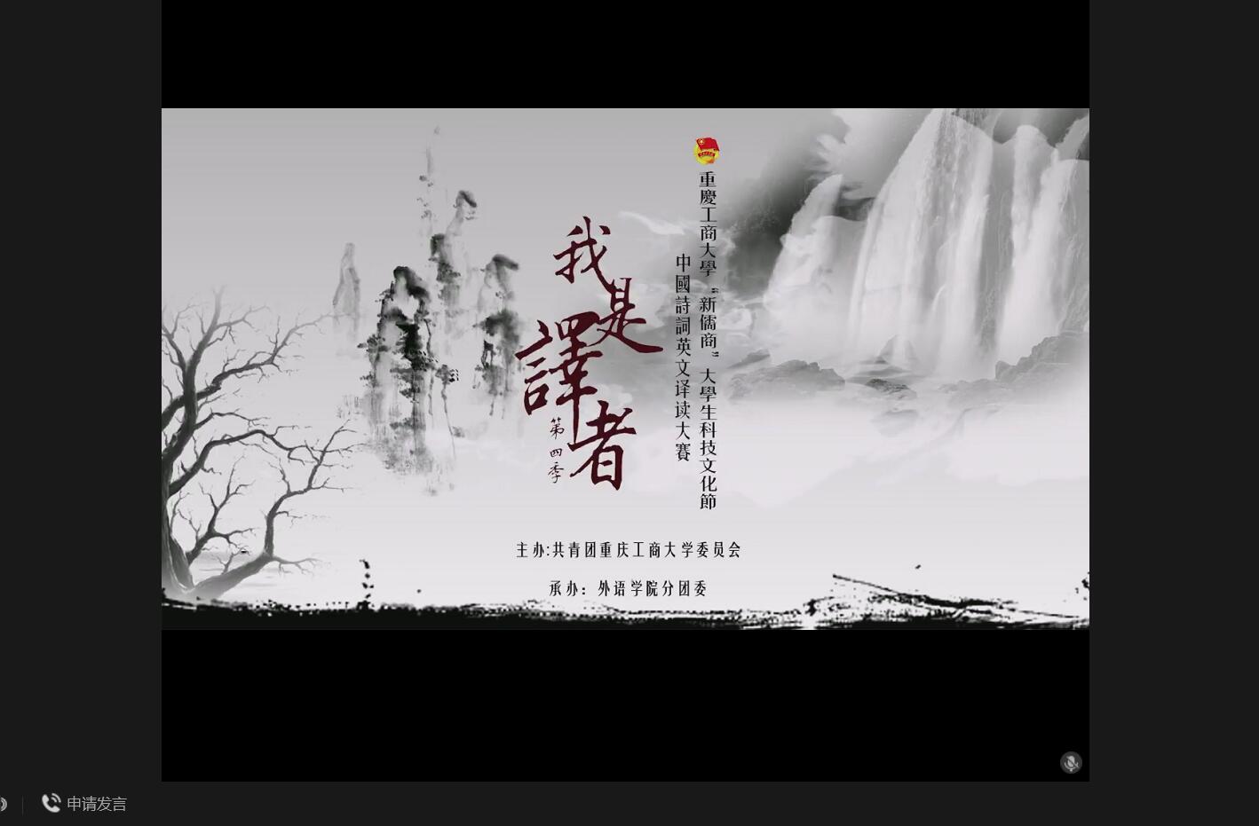 两位获奖选手罗冬梅同学和廖宿印同学分享了自己的参赛体验以及在翻译过程中的心得体会,并就 “翻译应注重忠于原文还是言外之意”、“如何有效的押韵”、“如何在翻译过程中解决中外文化差异的问题”等问题向点评嘉宾进行了提问。活动中,新葡的京集团35222vip的同学通过“云合唱的方式”演绎了歌曲《Fight As One》,通过歌曲展现中国人民在抗击新冠病毒疫情中所体现出的必胜信念和团结一心。活动尾声,新葡的京集团35222vip副经理周琳对本次活动做了总结,号召同学们用专业所学向世界传播中国传统文化。