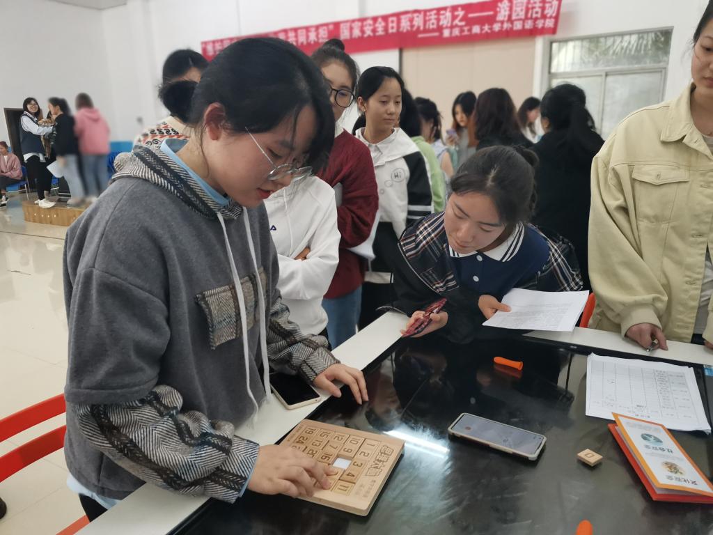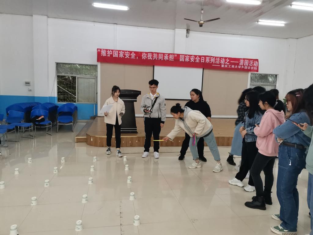 此次活动分为四个部分:1、嘉宾致辞;2、热身拔河;3、游园活动;4、颁奖仪式。首先,新葡的京集团35222vip党委书记唐春秋对本次活动致辞,强调作为外院员工,更应该时时堤防,维护国家安全。接着,以拔河比赛作为开场白,开始了紧张又有趣的比赛,比赛分为三个项目,连环套答题,数字华容道答题,掷骰子答题,尤其在掷骰子环节,大家想方设法多积分,直呼过瘾,活动结束后,工作人员对每位选手所得积分进行排名,最后由专职辅导员黄颖婕为获奖者颁奖并合影留恋。