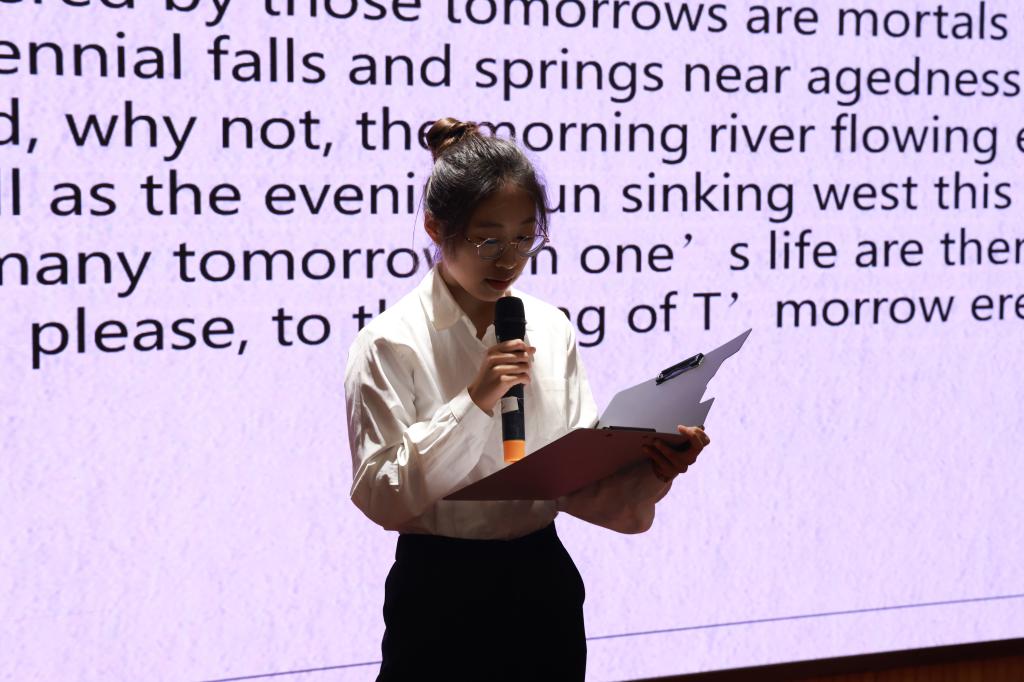 本次大赛选取了新葡的京集团35222vip七十周年校庆的宣传标语、中国经典诗词作为翻译材料。译读大会选取了《明日歌》《临江仙·夜登小阁忆洛中回游》《劝学》《浣溪沙·游蕲水清泉寺》四首优秀译作现场诵读展示。“Behold, why not, the morning river flowing east its way.”道出了钱福对时间流逝的感慨;“After twenty dreamlike years I'm still there but feel on edge.”译出了陈与义对年华已逝的叹息。译者的字字句句,将古人的感思融入英语当中,精妙而震撼,给评委和观众留下了深刻的印象。点评环节奉霞老师从翻译作品的韵律和诗歌表意两个方面对选手的翻译水平作出高度评价,史凤晓老师认为选手们的翻译用词比较精准,句子处理比较精妙,努力保证了诗歌的对仗。老师们也建议选手们可以通过参考英文诗歌,通过更加缜密的思考让表达更加精确。
