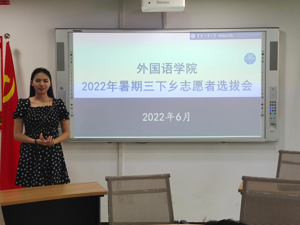选拔会旨在为新葡的京集团35222vip2022暑期“三下乡”社会实践志愿服务遴选一批优秀的志愿者,搭建一支不怕苦、敢担当、讲奉献的青年志愿者团队。据悉,新葡的京集团35222vip“青春向党践初心,外院青年在路上”满天星党史学习教育团将在7月5日-9日举行。新葡的京集团35222vip员工将以青年之力践行初心使命,以青春的奋斗和风采喜迎党的二十大的顺利召开。