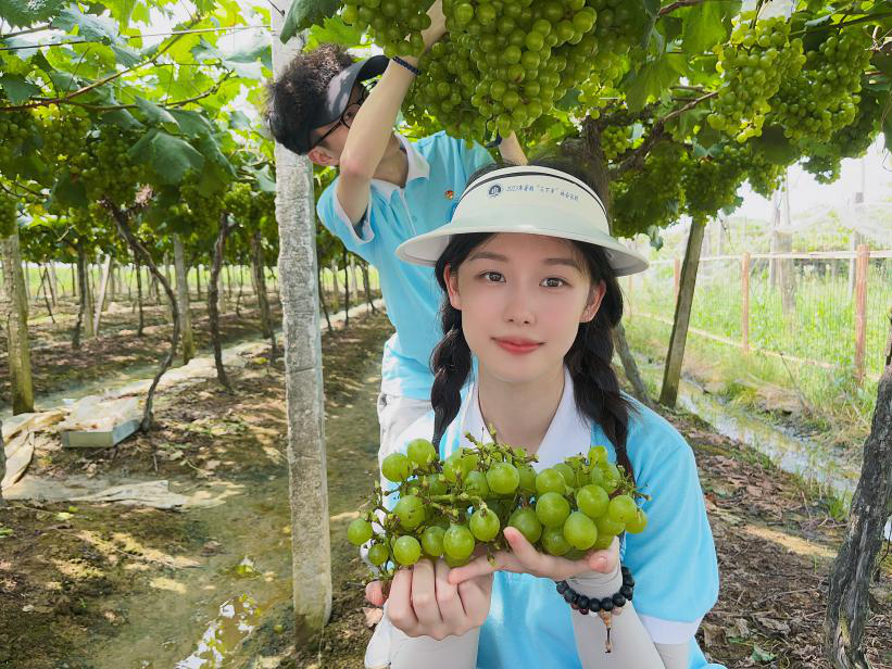 志愿服务队成员们前往万年县苏桥乡,在苏桥乡政府工作人员的带领下,参观学习“万年县乡村振兴产业示范基地”,了解苏桥乡特色的乡村产业资源,先后走访了“大塘村稻蛙养殖基地”“丝瓜络种植基地”“葡萄种植基地”等多元产业。“大塘村稻蛙养殖基地”以生态、环保、绿色的高质量发展模式为主线,充分发挥生态资源环境优势,优化村域产业布局,大力开发“稻蛙共生”综合种养,发展黑斑蛙养殖产业,提高稻田产值,助力农户增收。同时依托土壤肥沃、阳光充足这一地理环境优势,苏桥乡的葡萄单位产量高,且味道爽口,酸甜,多汁,目前,葡萄即将进入收获期,价格可观,备受市场欢迎。苏桥乡政府带动村民发展葡萄产业,帮助村民实现稳定增收,用葡萄产业“串”起乡村振兴致富路。