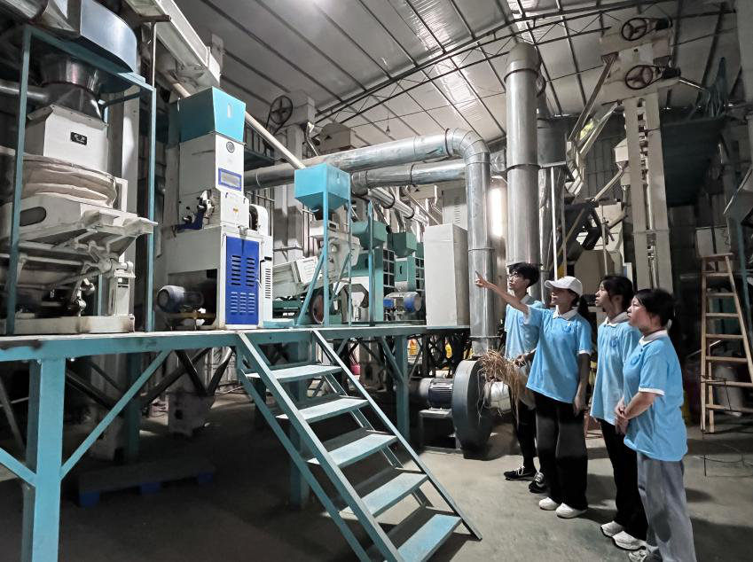 在政府工作人员的带领下,志愿服务队前往裴梅镇贡米加工厂,志愿服务队了解到,市面上人们所购买的万年贡米是经过加工厂稻谷除杂、去石、砻谷、谷糙分离、碾米、抛光色选、包装多重步骤精细加工生产的,万年县天然生长条件搭配良好产业技术,使得加工出的每一粒贡米都粒大饱满,洁白似玉。随后志愿服务队成员跟随厂区负责人踏入稻田中亲身感受栽种的过程。江西万年稻作文化系统是较早被联合国粮农组织认定的全球重要农业文化遗产,也是首批中国重要农业文化遗产。