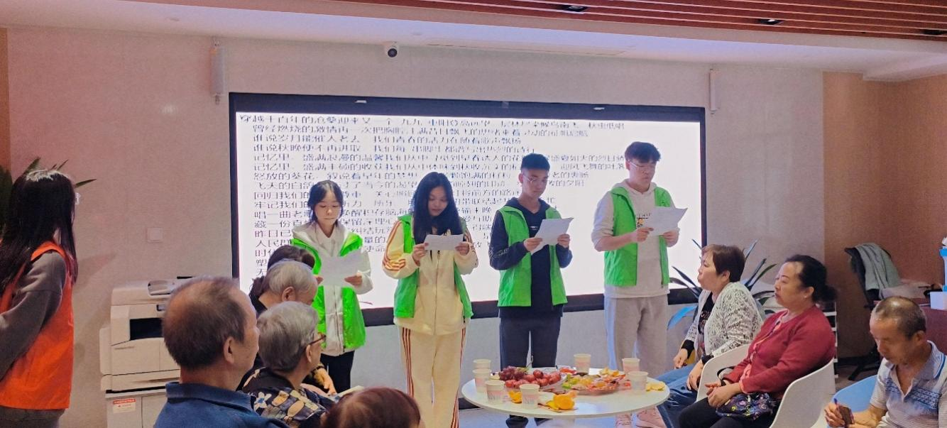 志愿者为老人们精心准备了诗朗诵、健康操以及手势舞,为老人带去欢声笑语。同时,也给老人们宣讲了有关保健、健康的知识以及生活小窍门,希望能为老人们的生活带去便利。最后,志愿者们为每位老人敬上菊花茶并献上自制的小礼物——手写贺卡,表达了志愿者们真挚深切的祝福,也让老人们在这属于他们的节日中感受到了志愿者们的温情。