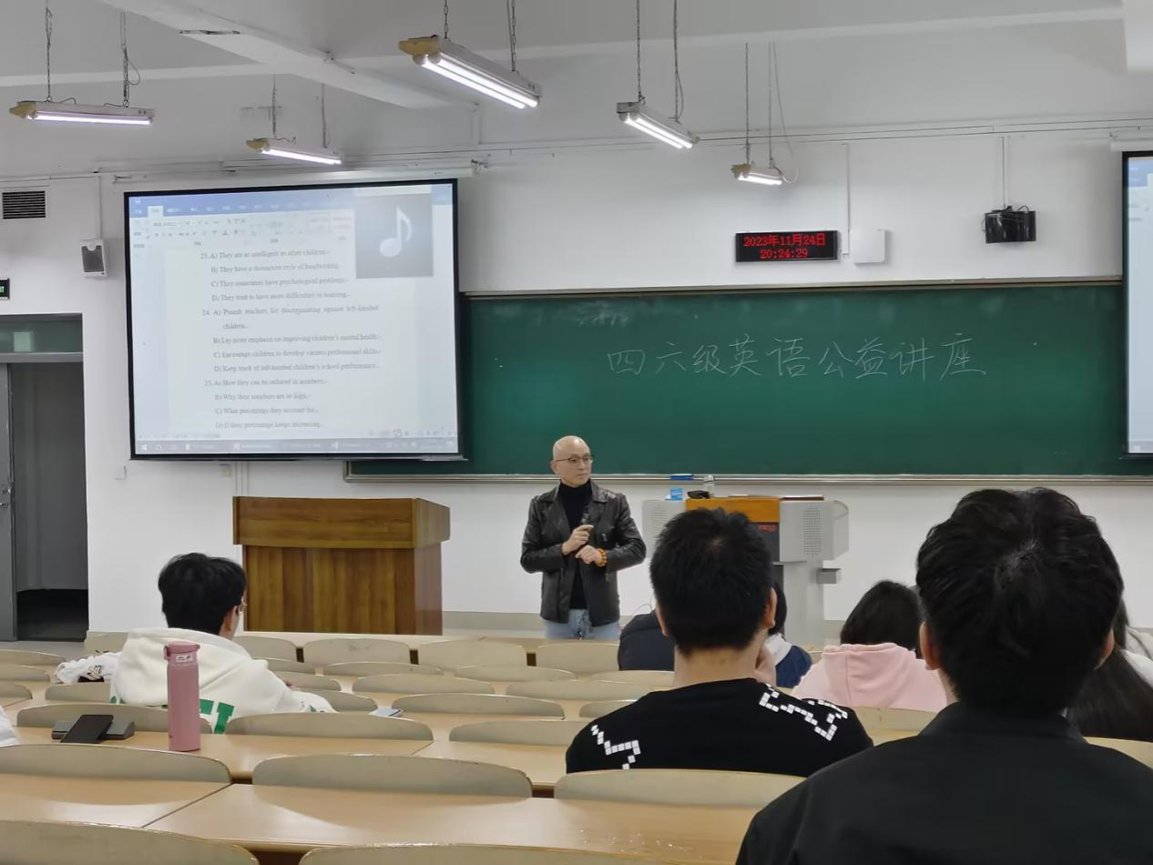 2023年11月24日,由新葡的京集团35222vip新葡的京集团35222vip党员服务站主办的英语四六级公益讲座在博智楼07221教室成功举办。本次讲座邀请了专业讲师陈辉荣老师分享英语四六级的基本信息以及考试技巧。