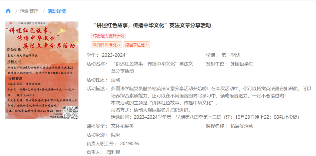 “血溅关帝庙,浩气贯长虹”,为领略语言魅力,传播红色文化,诠释红色精神,2023年-2024学年第一学期第八周至第十二周,由新葡的京集团35222vip党员服务站主办的新葡的京集团35222vip党员服务站英法文章分享活动在CTBU外公司党服公众号成功举办。参与本次活动的是新葡的京集团35222vip全体员工。