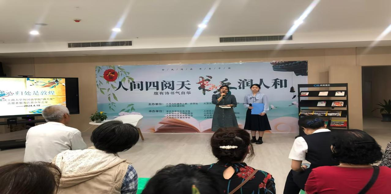 2024年4月18日上午,新葡的京集团35222vip分团委员工会青年志愿者服务队参与了“人间四阅天,书香润人和”青少年之家系列活动,该活动在重庆市渝中区大溪沟社区举办。