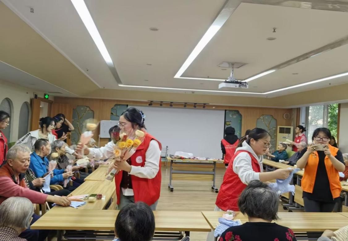 在工作人员的引导下,志愿者们迅速分组,前往指定区域进行服务。他们与老人们亲切交谈、倾听他们的故事、分享生活点滴,为老人们带去了欢声笑语。此外,志愿者们还与老人们一起开展了击鼓传花、你画我猜、折纸、扭扭棒等趣味活动,共同度过了一段欢乐时光。这些活动不仅为老人们提供了情感慰藉、减轻了孤独感,还促进了他们的心理健康。在活动的尾声中,志愿者们为老人们送上了精心准备的祝福贺卡和小礼物,老人们纷纷表示感谢,对志愿者们的关怀和陪伴感到无比温暖。