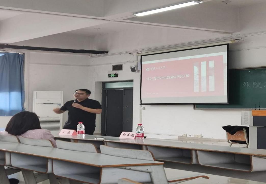 讲座中,丁亮副主任首先对当前的就业形势与政策进行了深入浅出的分析,强调了珠三角地区人力资源市场的活力以及内陆城市就业市场与发展需求的紧密联系,通过具体案例探讨了不同专业的地域就业优势。其次,他对外语类员工的多元化职业选择进行了详述,包括考公、考研、外贸和教育等多个领域,同时分析了这些领域的稳定性和人才需求状况。最后,丁亮副主任针对毕业生普遍面临的就业难题进行了细致解读,并对比了企业、公考、升学之间的区别与联系,进一步拓宽了同学们的职业视野。
