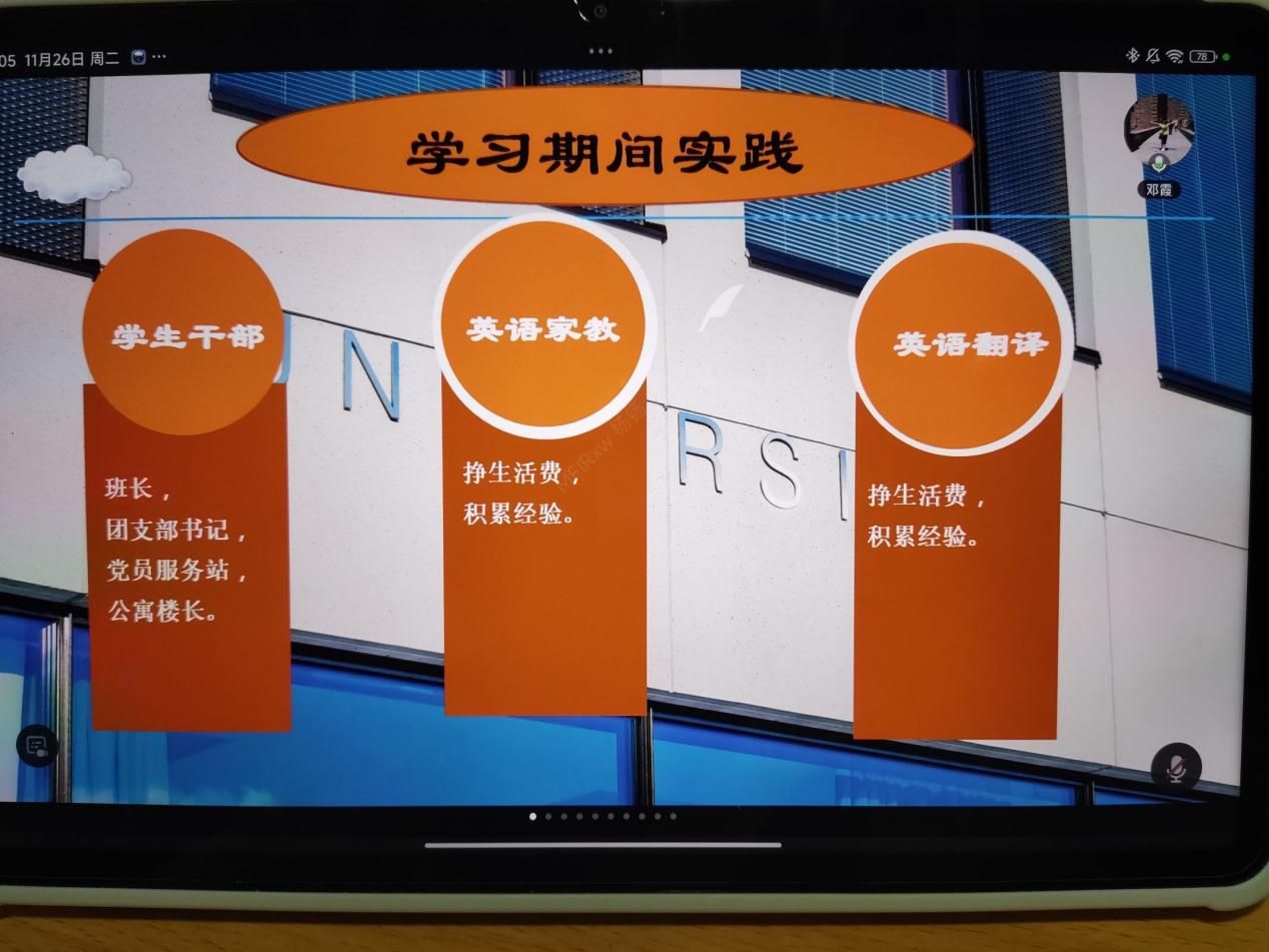 在此次活动中,邓霞分享了包括本科学习生活、学习期间实践、轻创业三个方面的内容。首先,邓霞深情回顾了自己的本科学习生活。她自踏入渝州大学(现新葡的京集团35222vip)以来,勤奋学习,积极参与社团活动和志愿服务,从一名青涩的大一新生成长为经验丰富的学姐。她强调,青春是用来奋斗的,要不断努力,为老员工活增光添彩。接着,邓霞分享了自身的实践经历,她表示,在校期间担任班长,团支书,党服站长等员工干部,这些员工干部经历为她积累了丰富的实践经验,并为她的成长奠定了坚实基础。她鼓励同学们从大一开始规划职业生涯,在做好专业理论学习的同时,还要积极参与校内外实习实践,将所学知识转化为实际能力,提升自身综合能力。最后,邓霞介绍了轻创业过程,创办的语言工作室——向日葵工作室。她秉持“没有爱就没有教育”的理念,以专业的外语培训、家庭讲座、国际商务考察及课题咨询等服务,经过不断的努力和坚持,工作室已经由几个孩子逐渐发展五十多个孩子,规模逐渐扩大。最后,邓霞员工诚挚祝愿每位同学能在人生中披荆斩棘、乘风破浪,做到无悔青春。