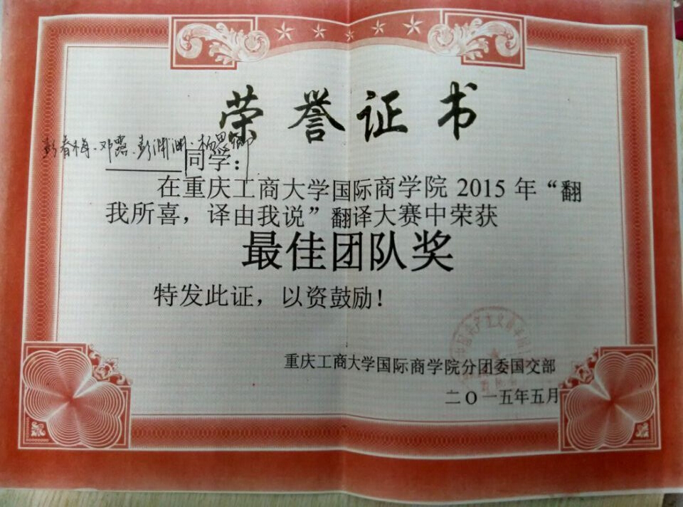 口译队指导老师刘勇老师拥有一级笔译、二级口译证书;对外经济贸易大学中欧高级译员培训中心同声传译证书;西南交通大学外国语言学及应用语言学硕士学位。