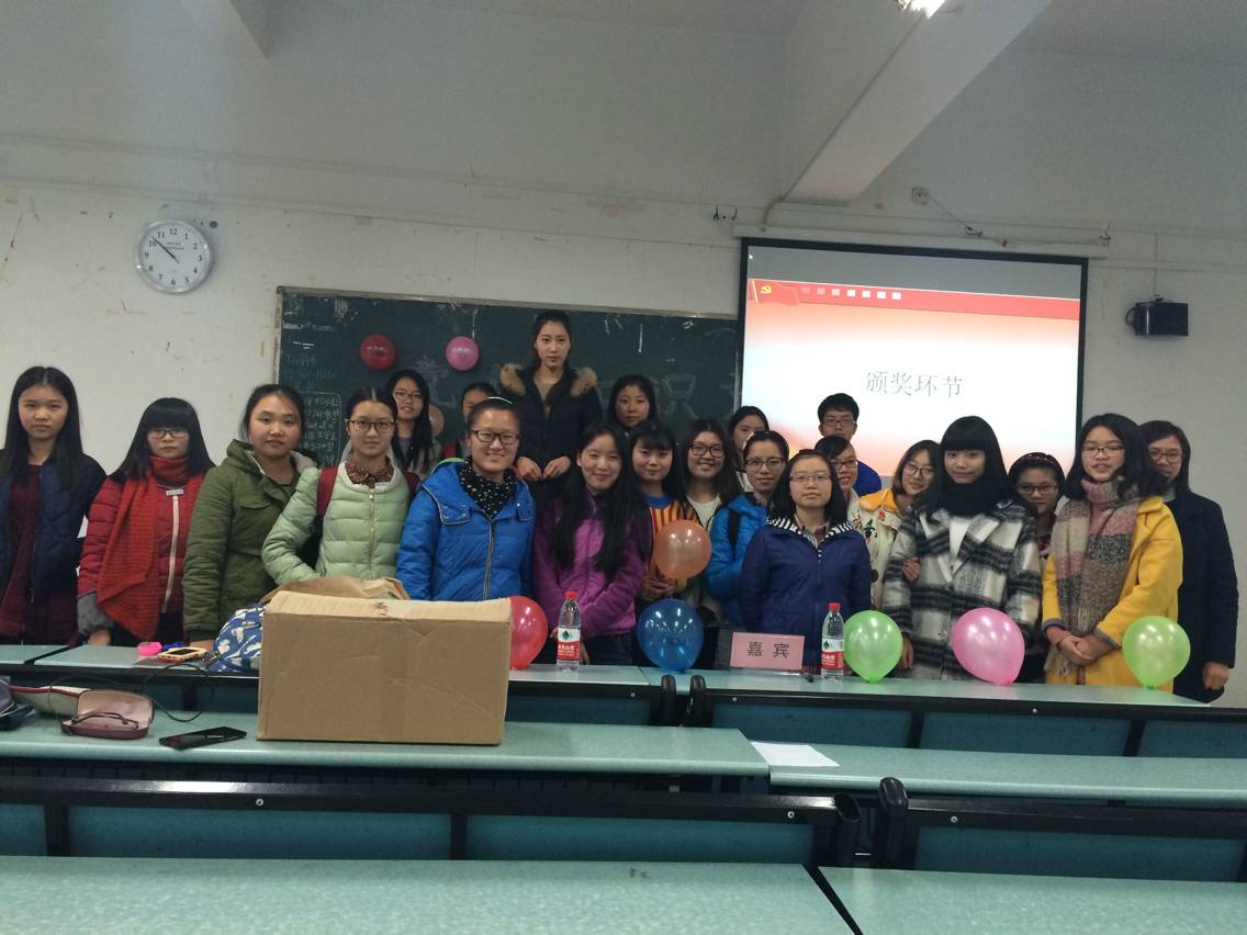 下午14:00知识竞赛活动正式开始。首先,主持人罗欣和吴俊泠简单介绍了参与本次活动的嘉宾、本次活动的流程及比赛规则,并请参赛选手们介绍了自己的队伍及队名,至此,本次比赛正式拉开帷幕。首先进行的是第一环节——有问必答。在这一环节中各组选手们均不甘示弱,以至于第一环节结束时有两组的分数持平。然后,在主持人的带领下,开始了让人振奋的第二环节——抢答环节。选手们实力旗鼓相当,知识储备丰富,竞赛题目似乎难不倒他们,所以就只有拼手速了,手速快则有机会赢得加分。而选手们的亲友团们的鼓掌声欢呼声似乎使选手们感到了振奋与激动,将整个活动推入了高潮。各位选手不分伯仲,难分胜负,所以进入附加环节,比赛也因此进入到了白热化的阶段,有的同学抢到了答题权的却与答案失之交臂,还有些同学因没有抢到答题权略显心有不甘。主持人的幽默便在此时发挥了效果非凡的作用,使大家平静了不少。在激烈的抢答后,最后一题的答题权被法语二班的选手们抢了去,而他们也不负众望赢得了这次比赛。最后,站长朱增艳为获得此次比赛的选手们颁发了奖品,主持人罗欣及吴俊泠也给参与此次比赛的选手们颁发了纪念品。最后在同学们的合影留念中,党的知识竞赛活动圆满结束。