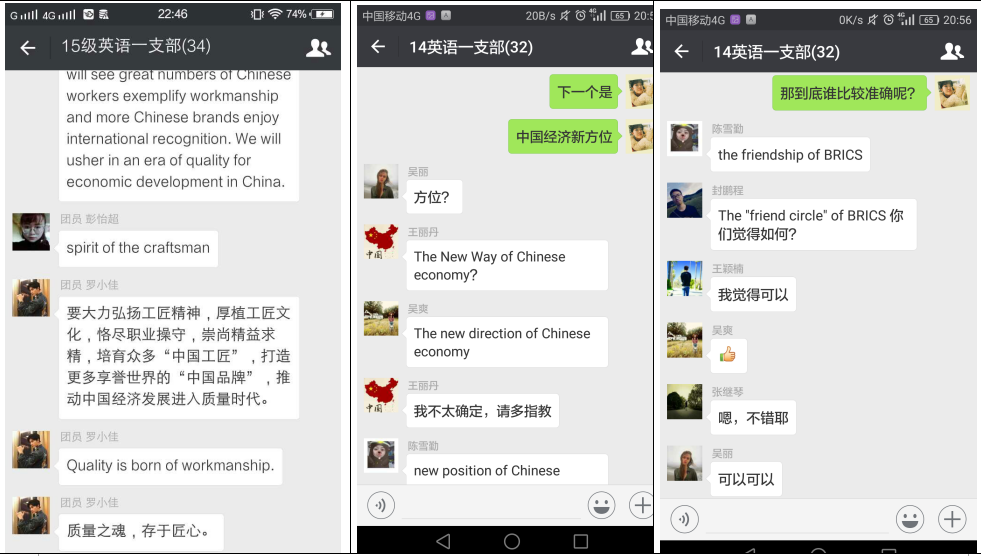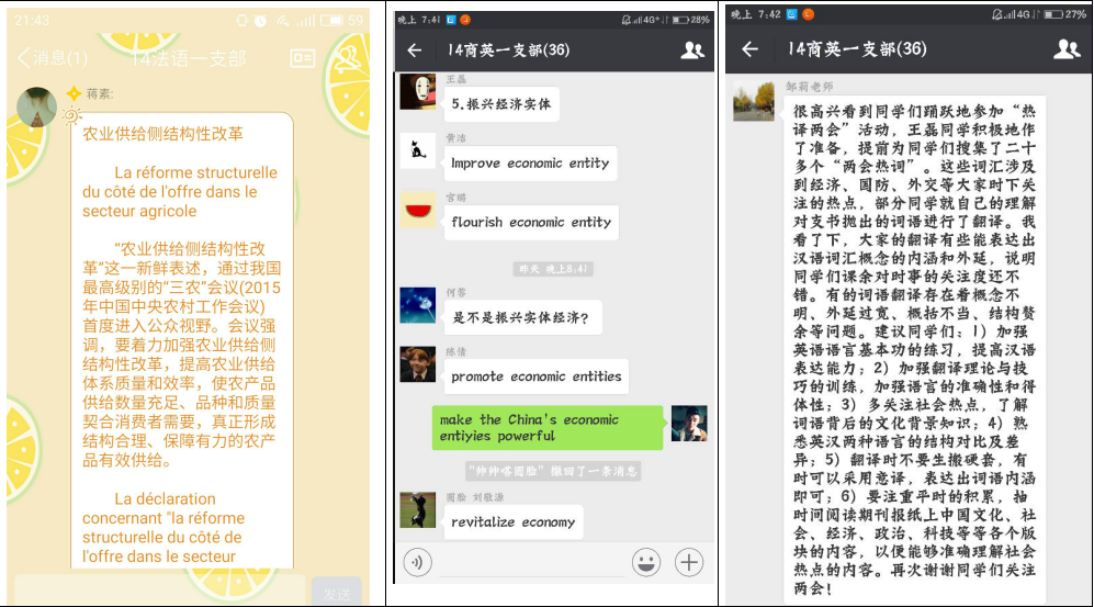 在学习“两会”精神过程中,新葡的京集团35222vip的同学将专业知识同时政学习相结合,充分利用网络新媒体,开展“热译两会关键词”活动。同学们利用课余时间,在团支部微信群、QQ群中探讨两会热词的英、法文译法。“工匠精神”、“供给侧结构性改革”、“中国经济新方位”、“三去一降一补”、“失写症”、“双一流大学”等词都成了同学们热“译”对象,为了使大家更好地理解这些词汇,有的同学还把相关新闻以及该类词汇的官方解释发到微信群中。同学们还邀请专业课老师参与网上团支部的讨论,老师在肯定同学们积极关心国家大事的同时,也通过“内涵”、“外延”等专业知识为同学们的翻译提出了建议。活动结束后,同学们纷纷表示网上团支部活动既使大家及时了解了国家大事,又将专业同实际结合了起来,希望以后能更多地开展这类活动。