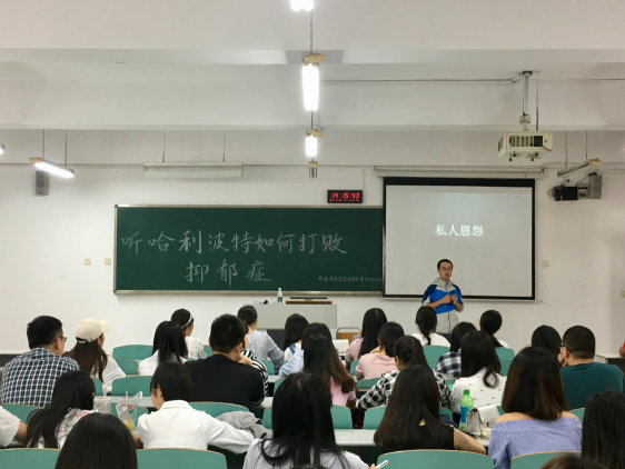 张老师以自己与哈利波特颇为相似的发型作了自我介绍,以其幽默的谈吐切入到了本次讲座。张老师在讲座中深入浅出,列举丰富,在座的同学们兴致勃勃,热烈参与到讲座当中。张老师通过讲述自身与抑郁症的渊源,哈利波特与抑郁症的关系以及哈利波特如何打败抑郁症,接下来同学们又观看了视频“哈利波特如何打败抑郁症”,电影中出现了一个对哈利波特极其重要的人物“卢平老师”,张老师说到,在电影中,卢平老师就是哈利生命中的发光体,就如同现实生活中心理咨询师一样,他们发掘病者生命中美丽的时刻和回忆,帮助患者走出心理困境。讲座最后,所有同学通过集体冥想的方式进入到一个美丽放松的境界,同时也向大家提供了一种新的放松方式。